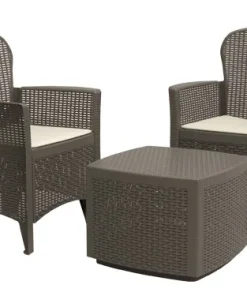Set da Giardino in Resina Effetto Rattan con Tavolo Contenitore + 2 Poltrone con Cuscini TREE