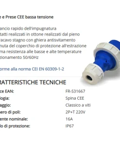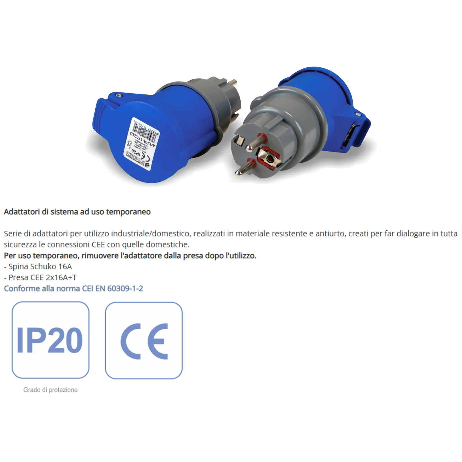 Conforme alla norma CEI EN 60309-1-2, questo adattatore offre una protezione IP20 contro acqua e polveri.