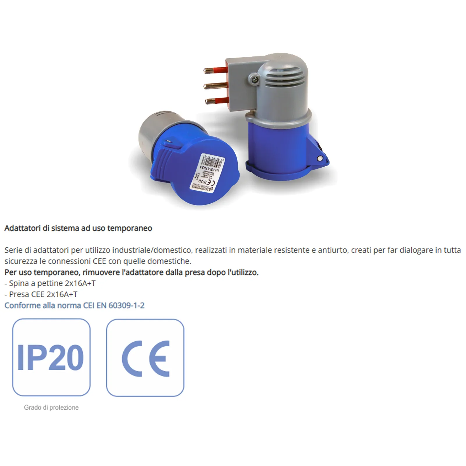 Adattatore da Presa Civile 2x16A+T a Spina Industriale CEE 2x16A+T FRIGGERI Monofase Uso Temporaneo IP20 articolo FR-17023