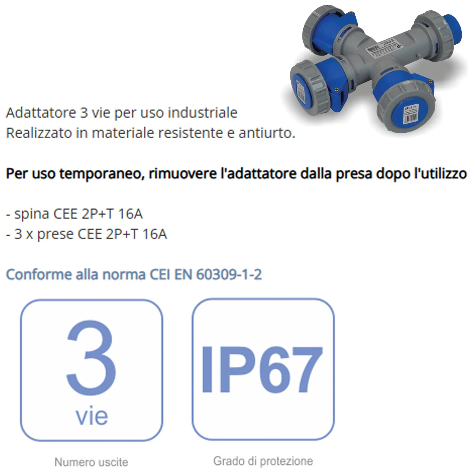 Questo adattatore monofase a 3 vie in uscita, per uso industriale, è realizzato in materiale resistente e antiurto, ideale per utilizzi temporanei.