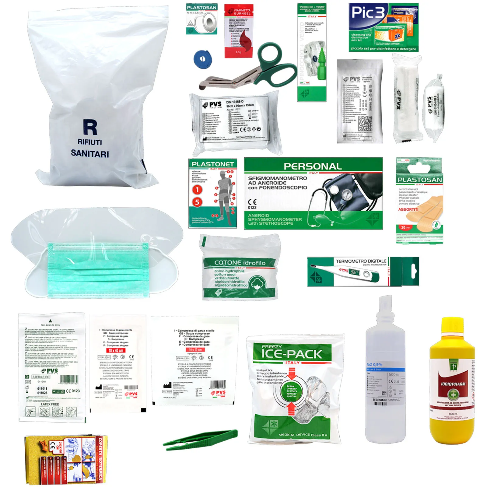 I prodotti definiti dispositivi medici, contenuti nel kit pronto soccorso sono conformi alla direttiva CE 93/42 al DL 24.2.97 e al 2007/47/CEE