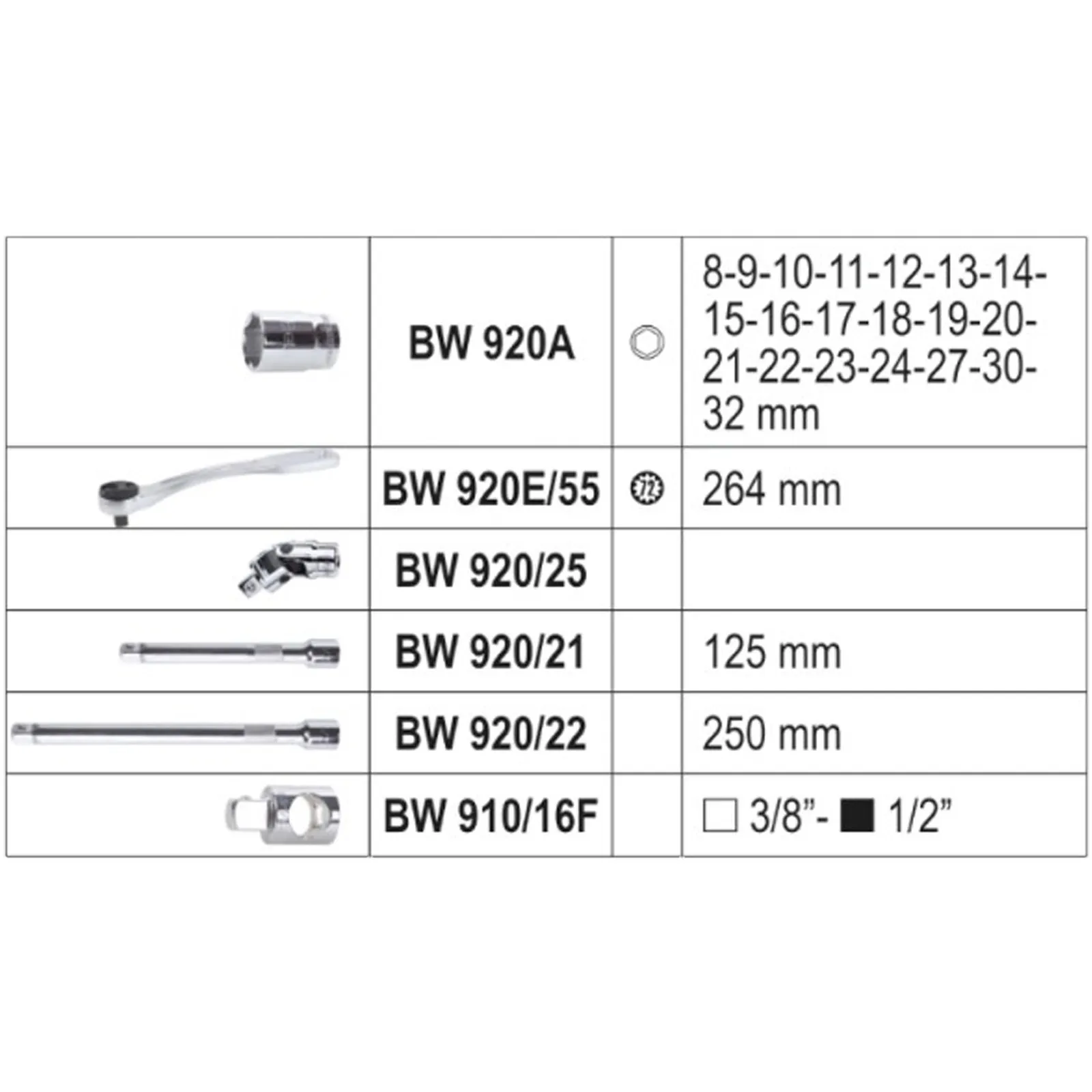 Cod. BW 920° – 20 Chiavi a bussola esagonali 1/2″ misure da: 8-9-10-11-12-13-14-15-16-17-18-19-20-21-22-23-24-27-30-32 mm