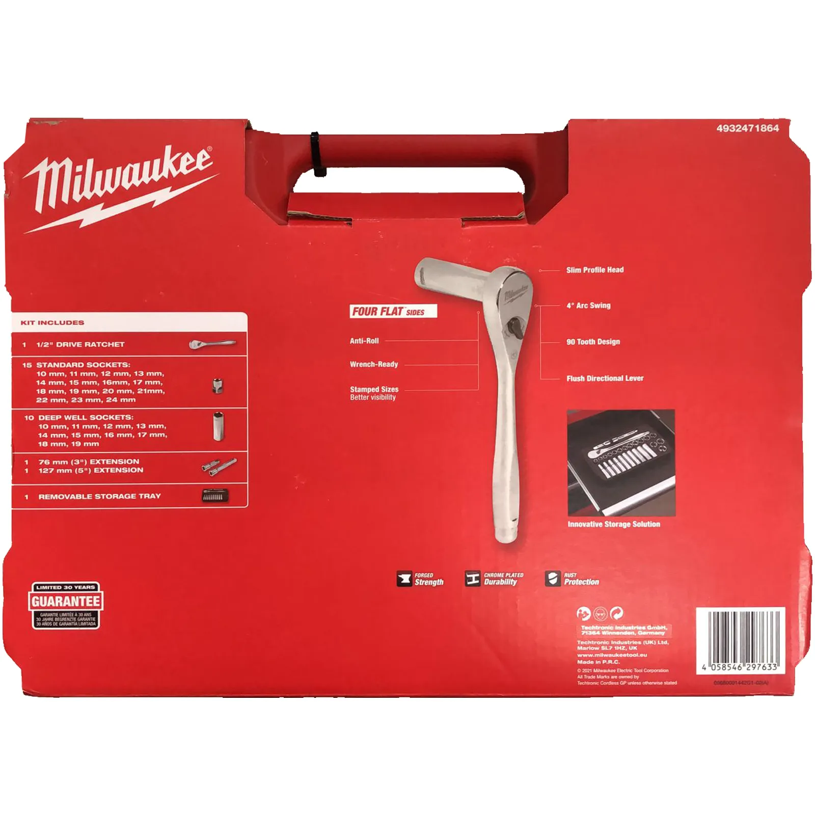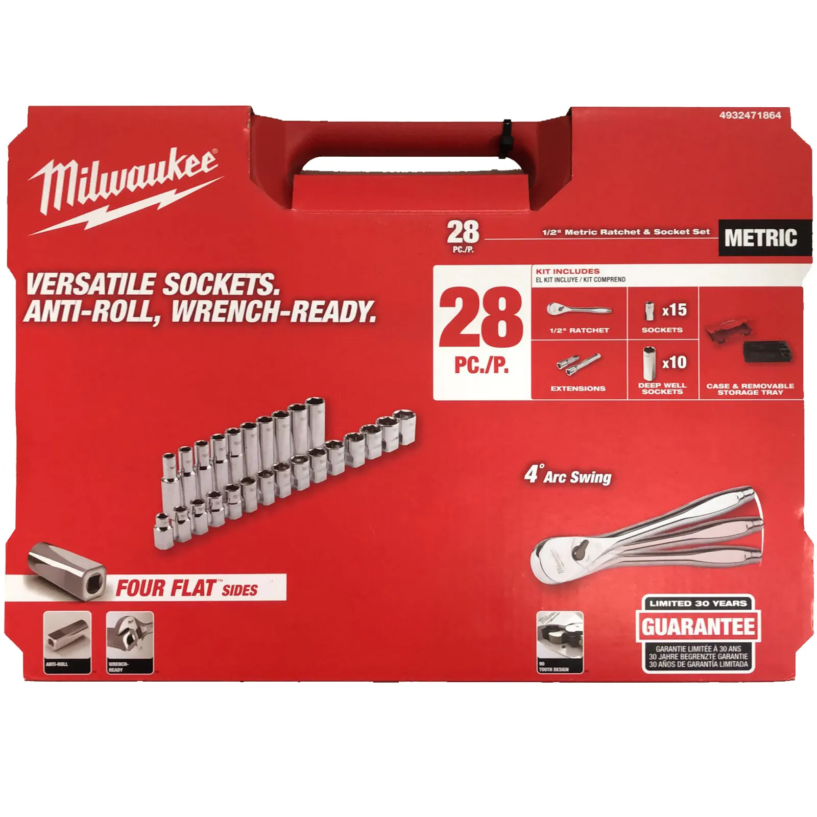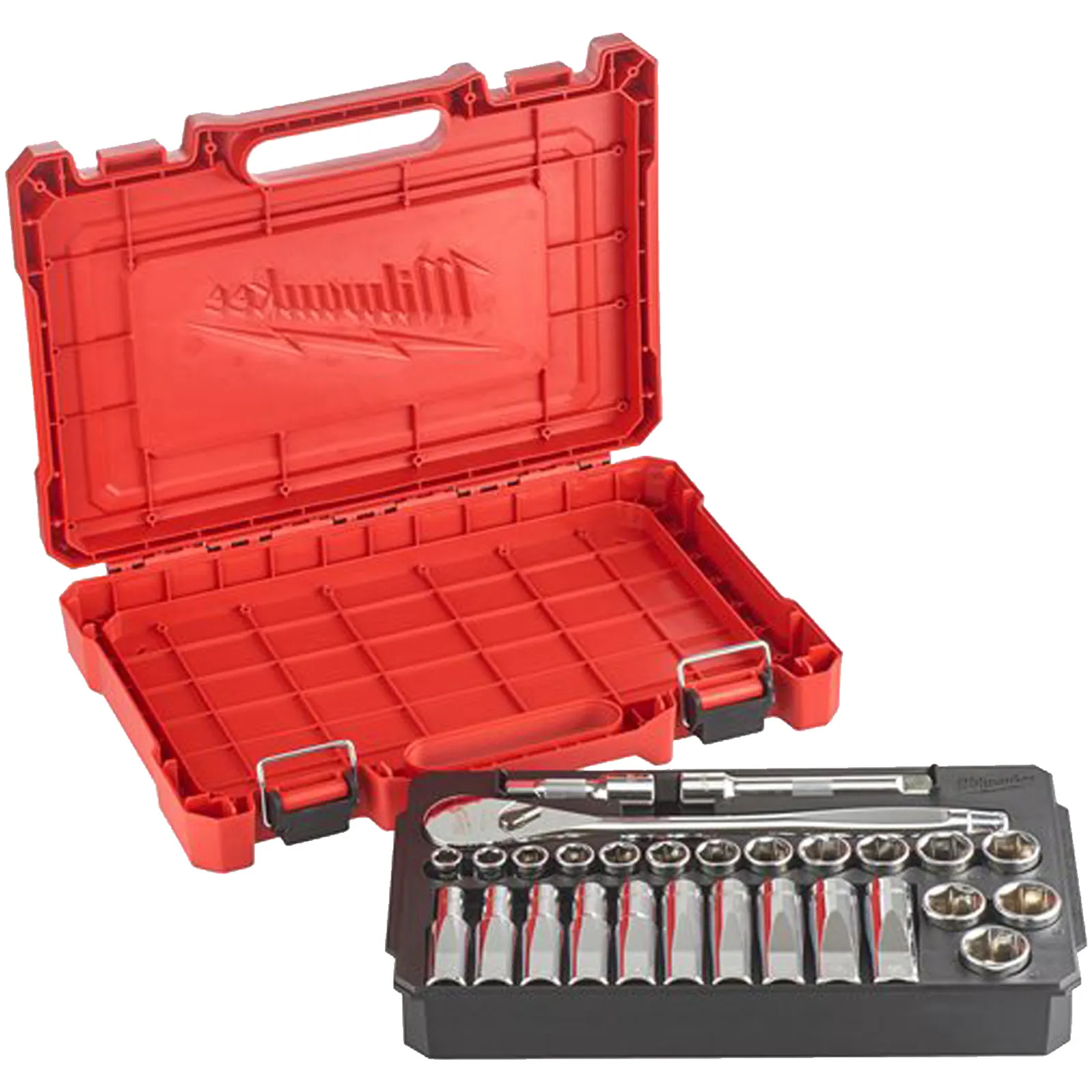 Valigetta 28 pezzi con bussole con attacco quadro 1/2″ corte, lunghe e prolughe, corredata di cricchetto reversibile Milwaukee.