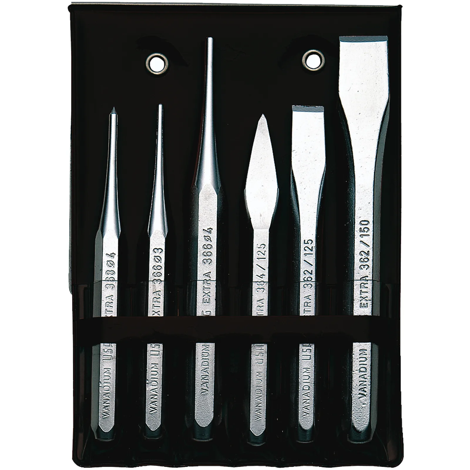 Serie di 6 Scalpelli in acciaio cromato forniti in pratica busta ripiegabile.
