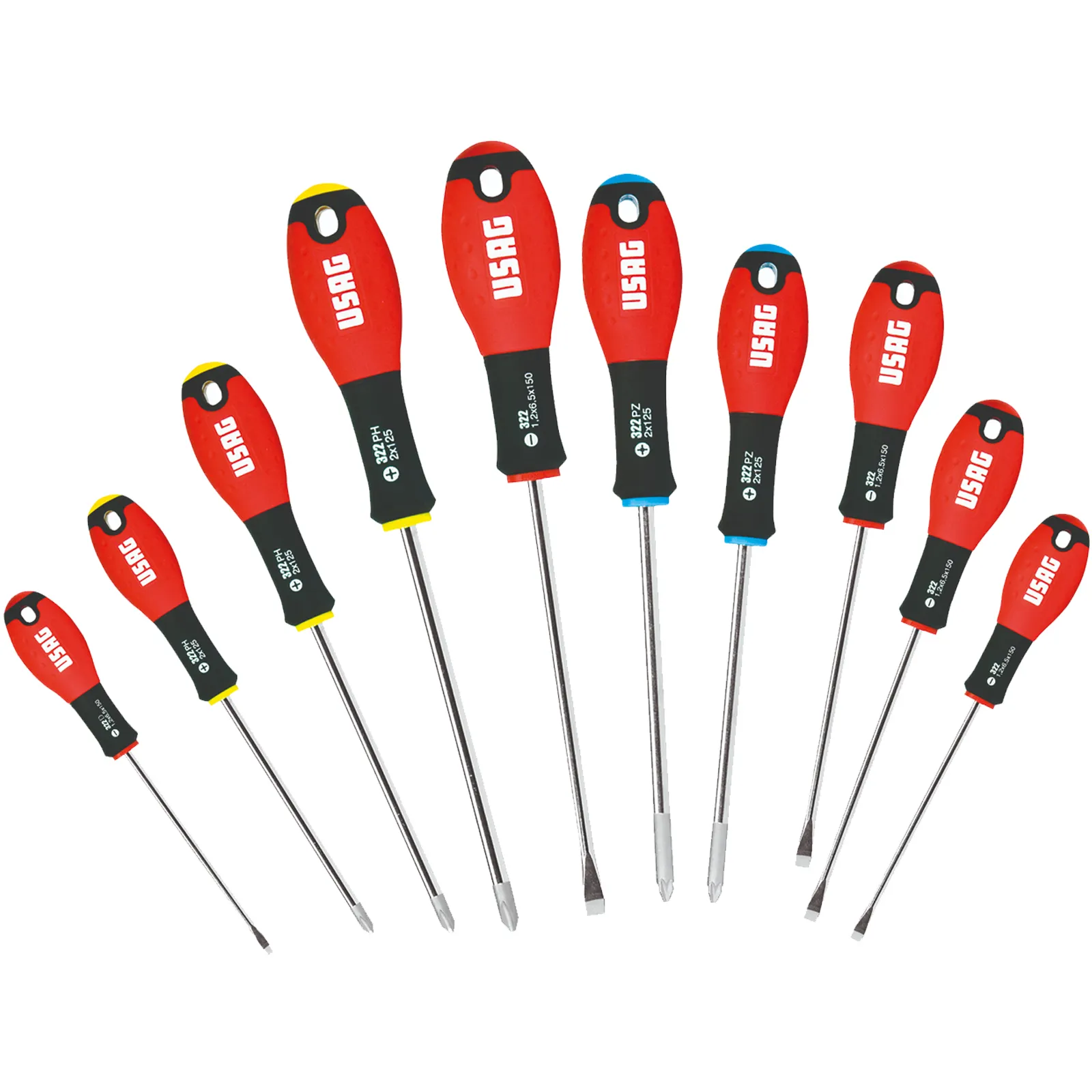Serie da 10 pezzi di Cacciaviti USAG per viti con intaglio, impronta a croce Phillips e impronta a croce Pozidriv.