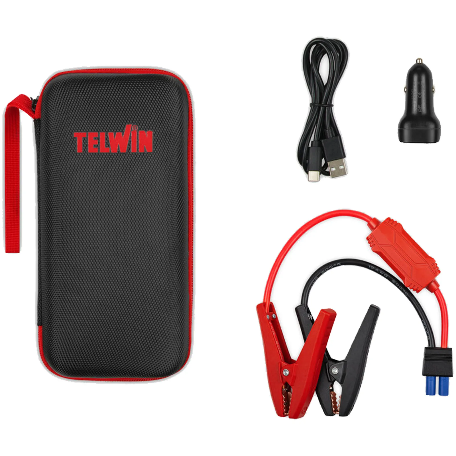 Completo di cavi di avviamento, 1 cavo di collegamento e 1 spina per accendisigari con 2 prese: 1 USB A ed 1 USB C.