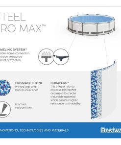 La robusta struttura in acciaio è dotata del nostro FrameLink System™ per un collegamento solido e sicuro fra gli elementi del telaio, con connettori progettati per impedire il contatto fra le parti metalliche, così da prevenire la formazione di ruggine. Il liner della piscina è realizzato in DuraPlus™ materiale ultraresistente a tre strati rinforzati per robustezza e resistenza alla perforazione: DuraPlus è infatti del 15% più resistente agli strappi, del 33% più resistente all’allungamento e dell’83% più resistente alle forature rispetto al normale PVC, così la tua piscina durerà estate dopo estate.
