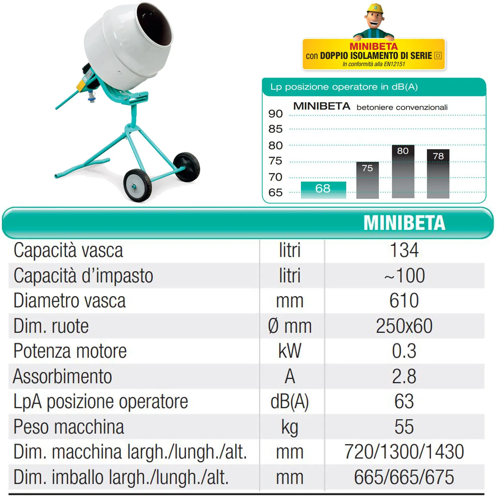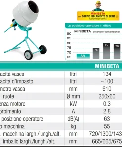 Dotata di doppio isolamento, la betoniera Minibeta è realizzata secondo la norma EN 60204-1 ed è protetta contro gli spruzzi d’acqua (IP55) nonché contro il sovraccarico e il riavvio accidentale dopo una mancanza di tensione.