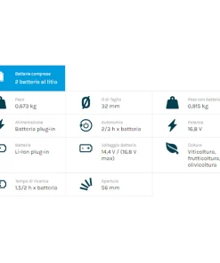 È fornita con due batterie, con ognuna delle quali è possibile effettuare 2-3 ore di potatura.