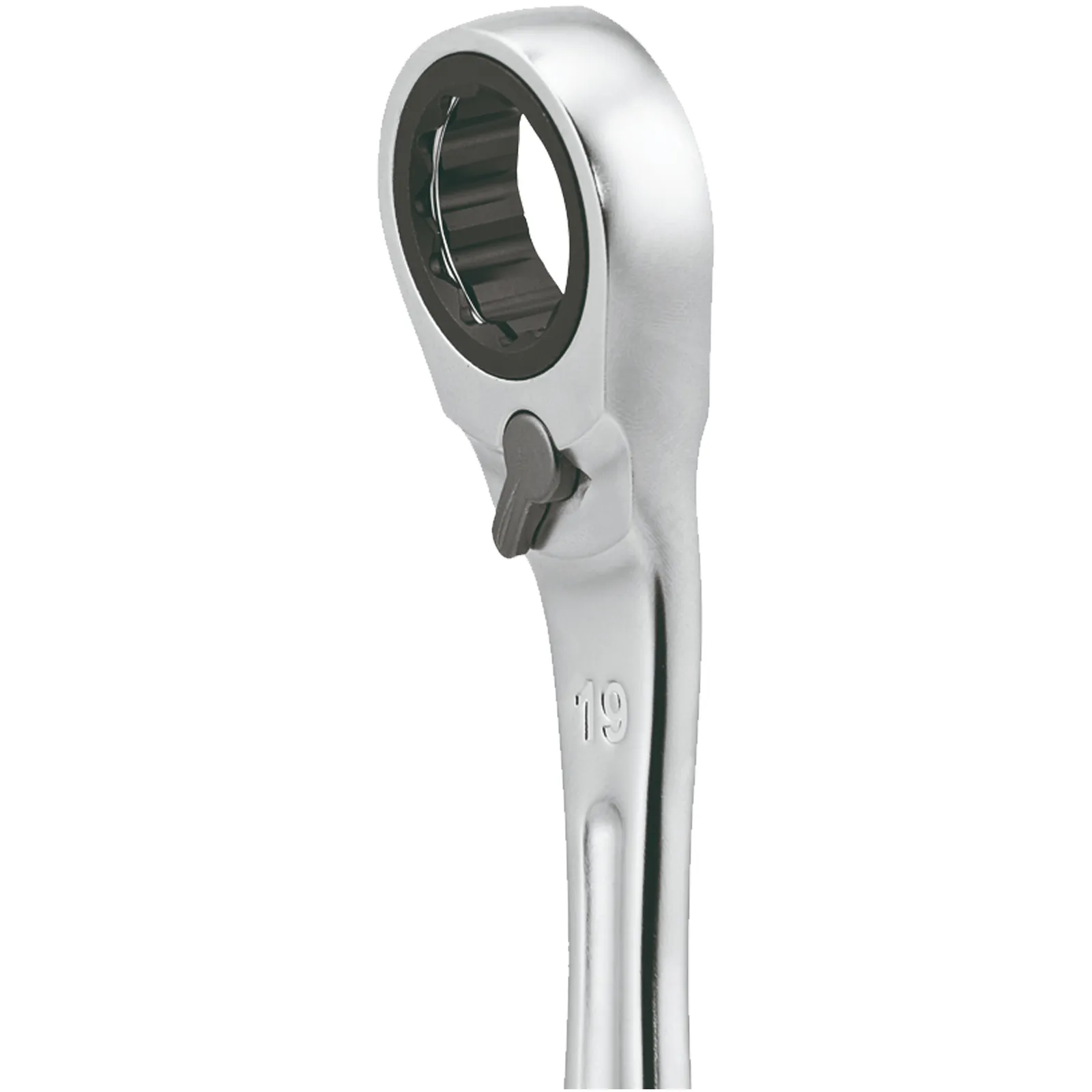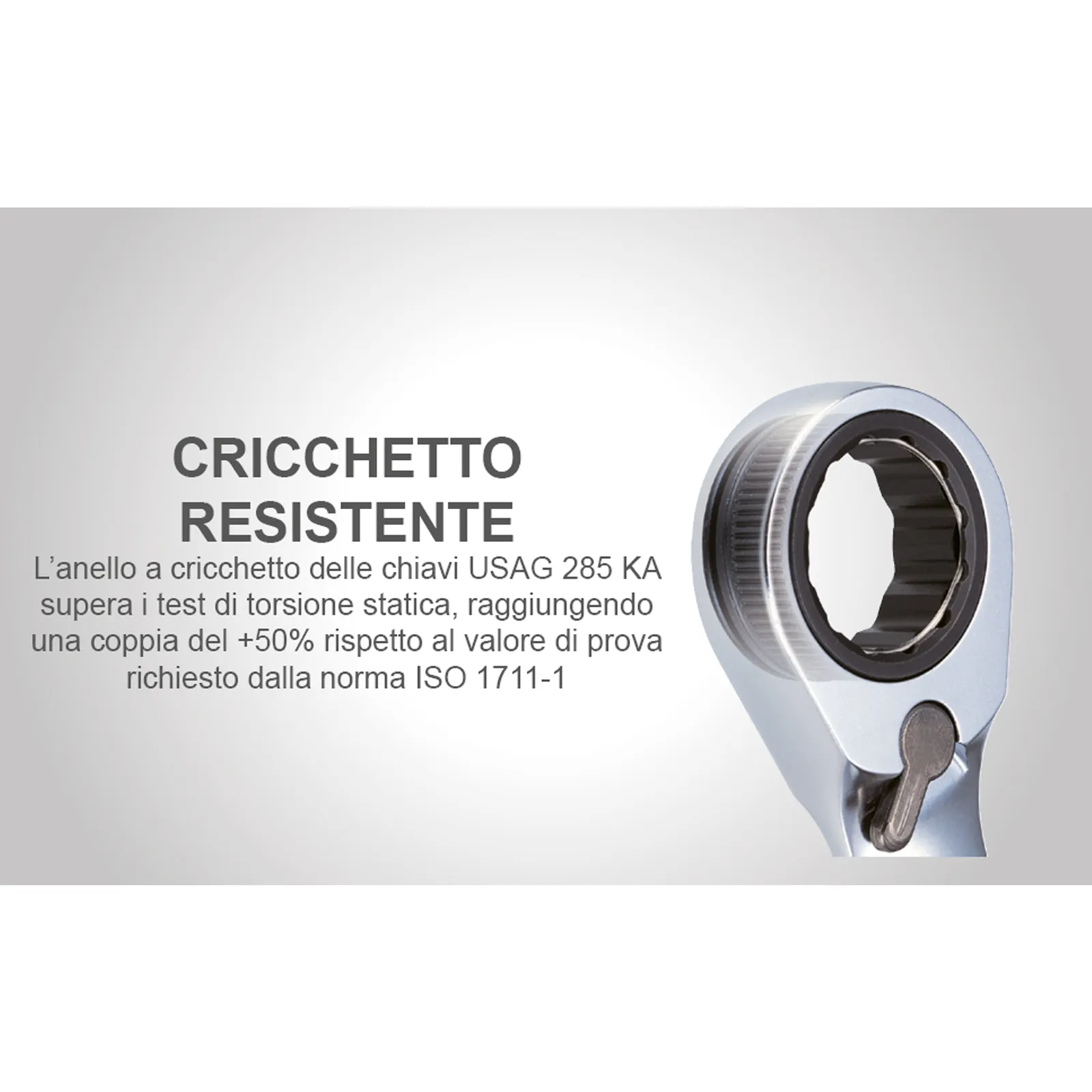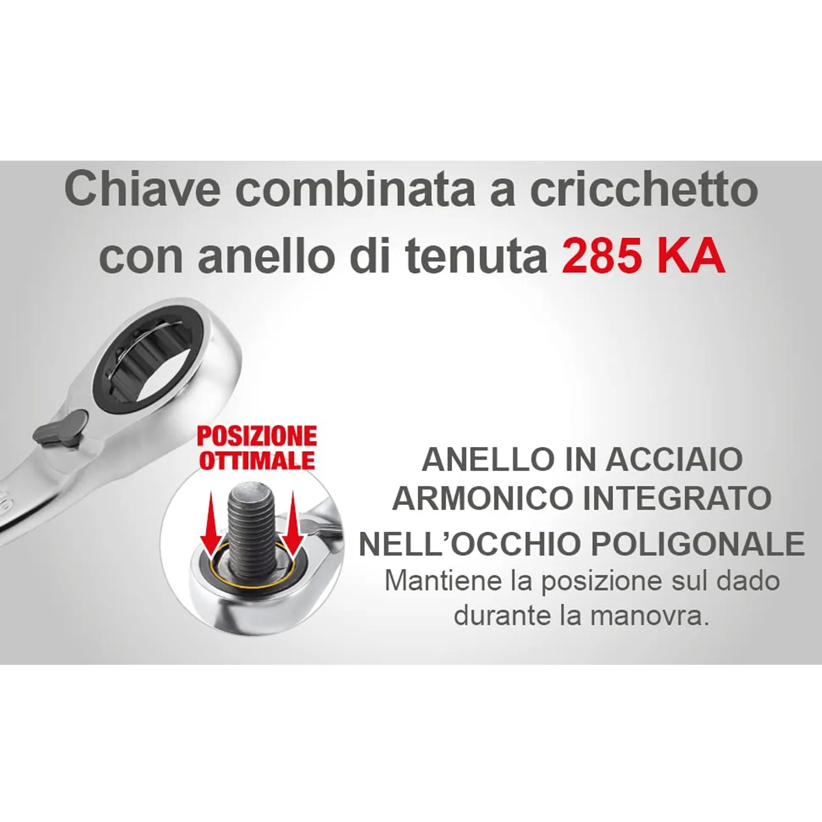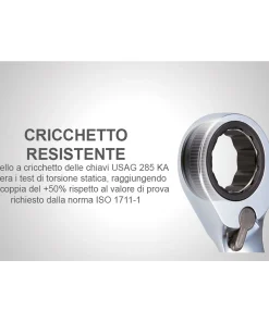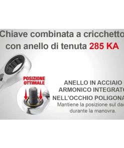 Chiavi combinate a cricchetto con anello di tenuta in acciaio integrato nell’occhio poligonale per la tenuta del dado durante la manovra.