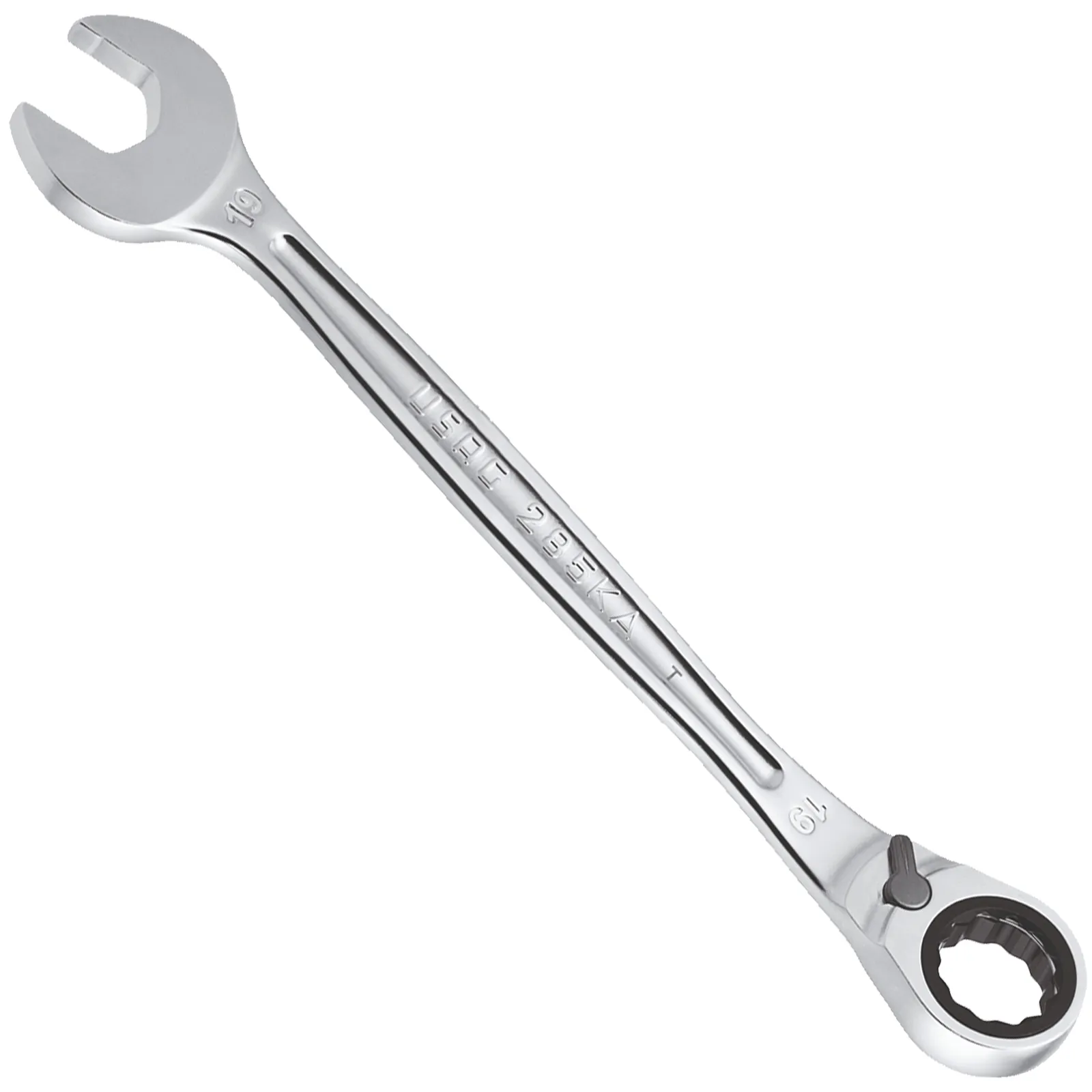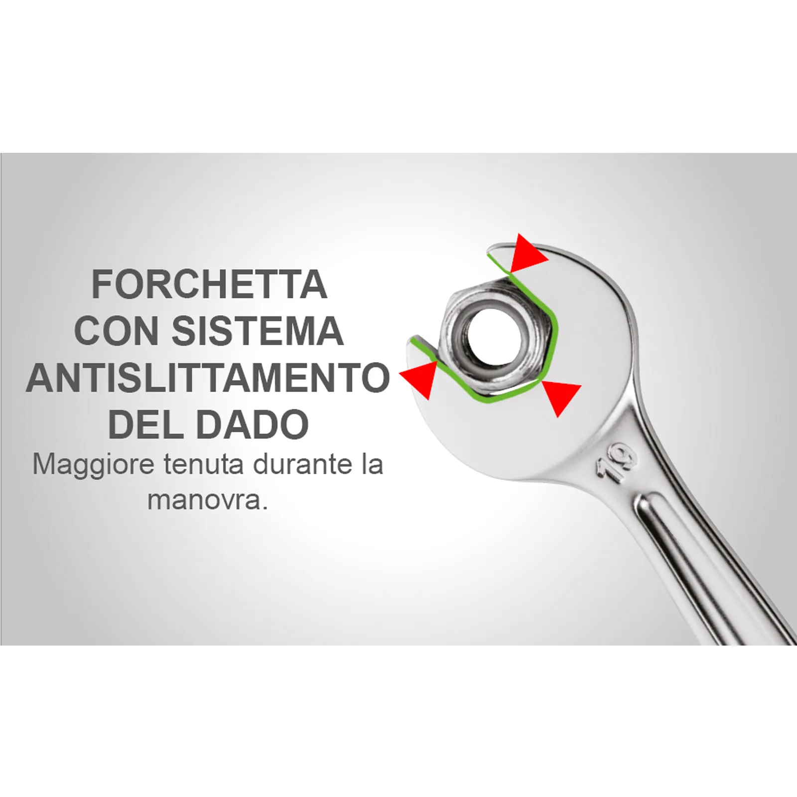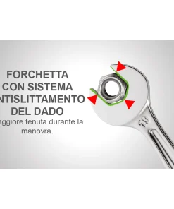 La chiave con forchetta con sistema antislittamento dell’esagono durante la manovra, ha la leva di inversione integrata.