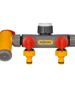 Il connettore per rubinetto a 3 vie consente di collegare due dispositivi di irrigazione o tubi flessibili direttamente a un rubinetto esterno ed è dotato di una terza uscita, costantemente accessibile e girevole, per dirigere l’acqua in un secchiello o annaffiatoio.