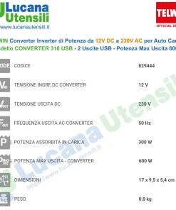 Convertitore inverter 12 VDC – 230 VAC ideale per alimentare in auto o camper, TV LCD o plasma, lampade alogene, rasoi, utensili elettrici in generale, e per ricaricare le batterie di computers, palmari, fotocamere digitali, videocamere, cellulari, elettroutensili etc.