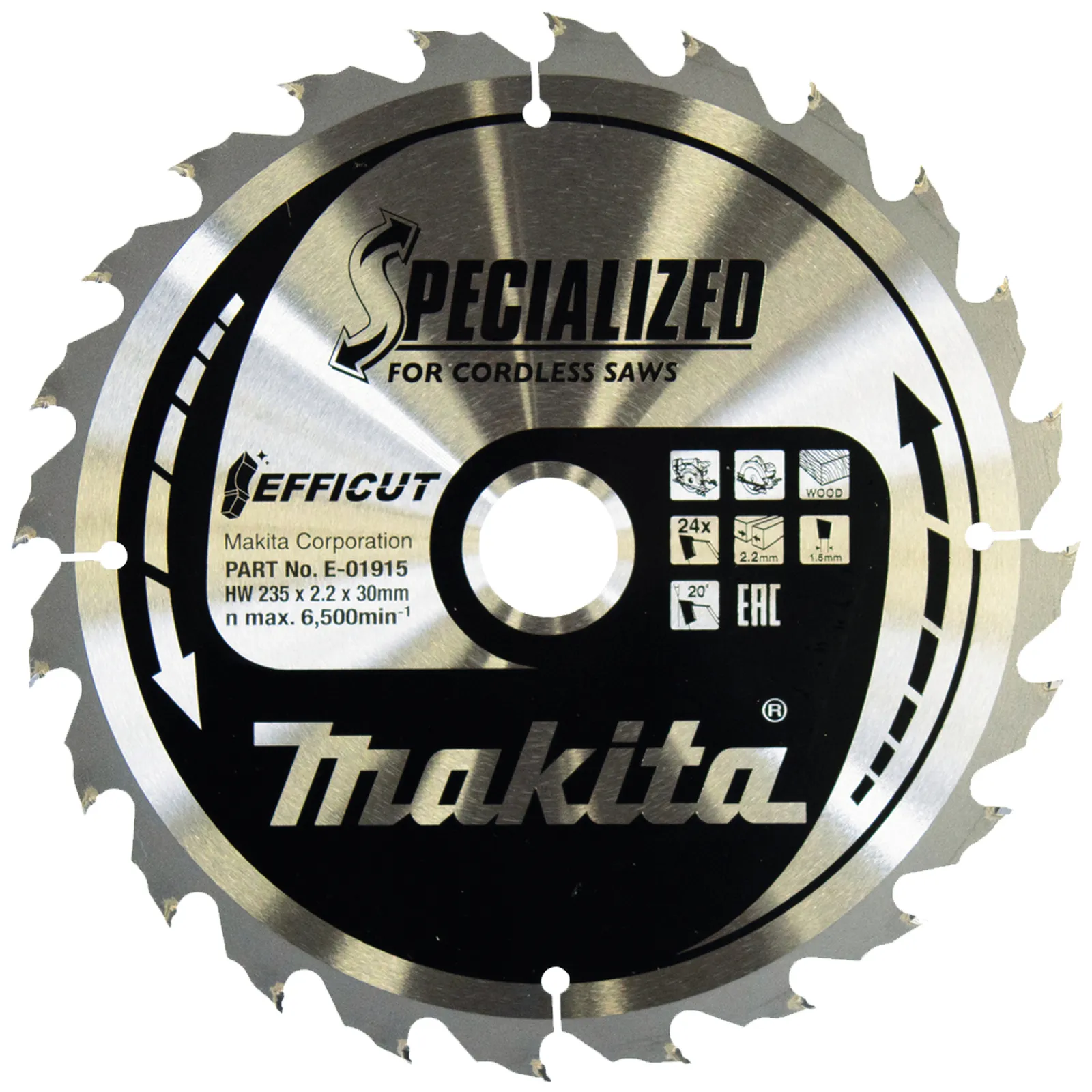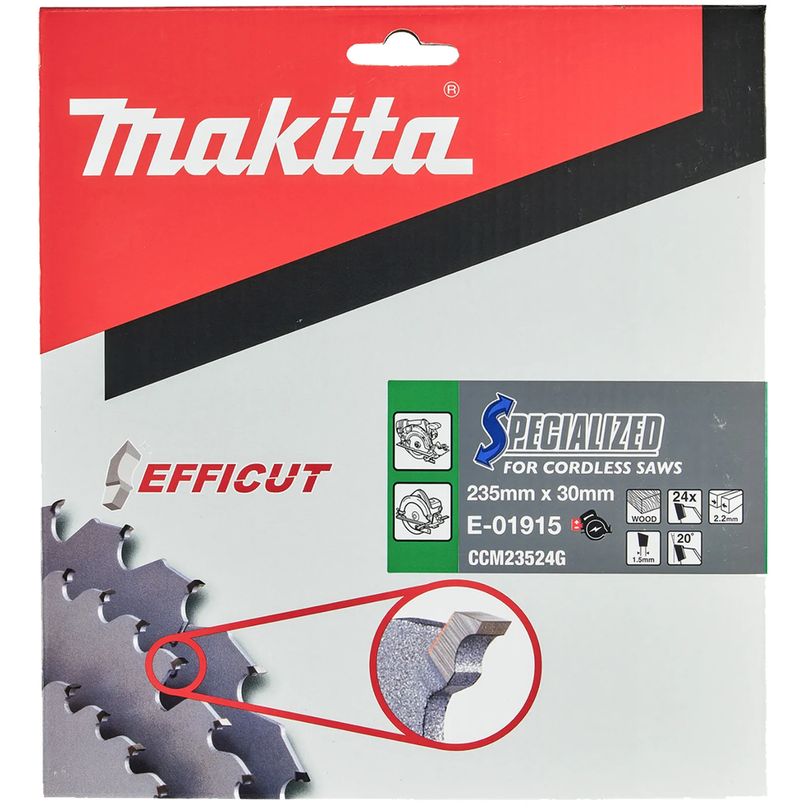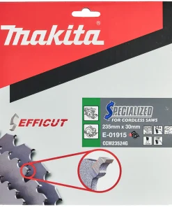 La lama Makita E-01915 ha un diametro pari a 235 mm ed un foro da 30 mm con 24 denti Efficut per tagli rapidi e puliti.