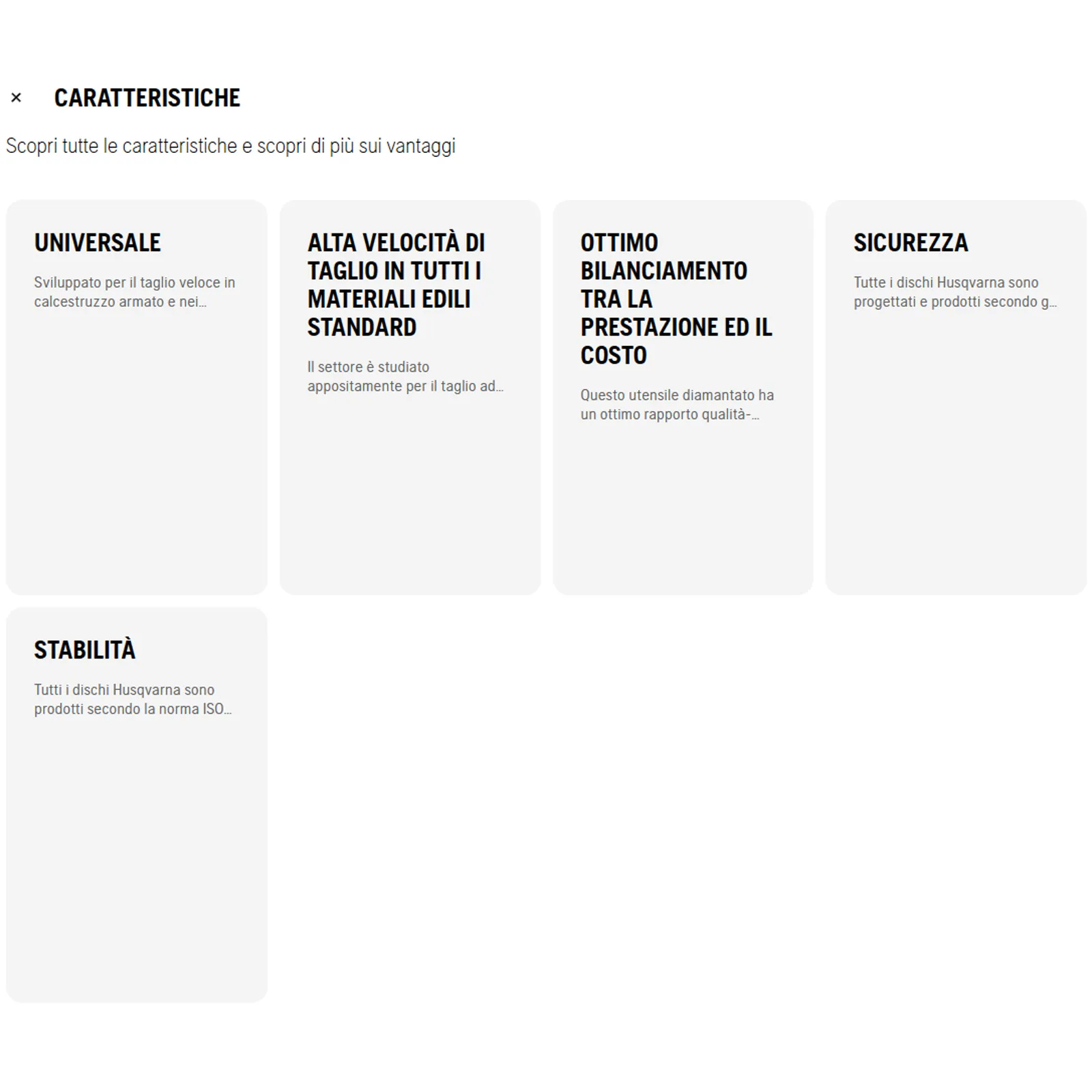 – Stabilità: Tutti i dischi Husqvarna sono prodotti secondo la norma ISO 9001, utilizzando i migliori materiali e metodi di produzione, garantendo un funzionamento stabile e costante del disco nel tempo.