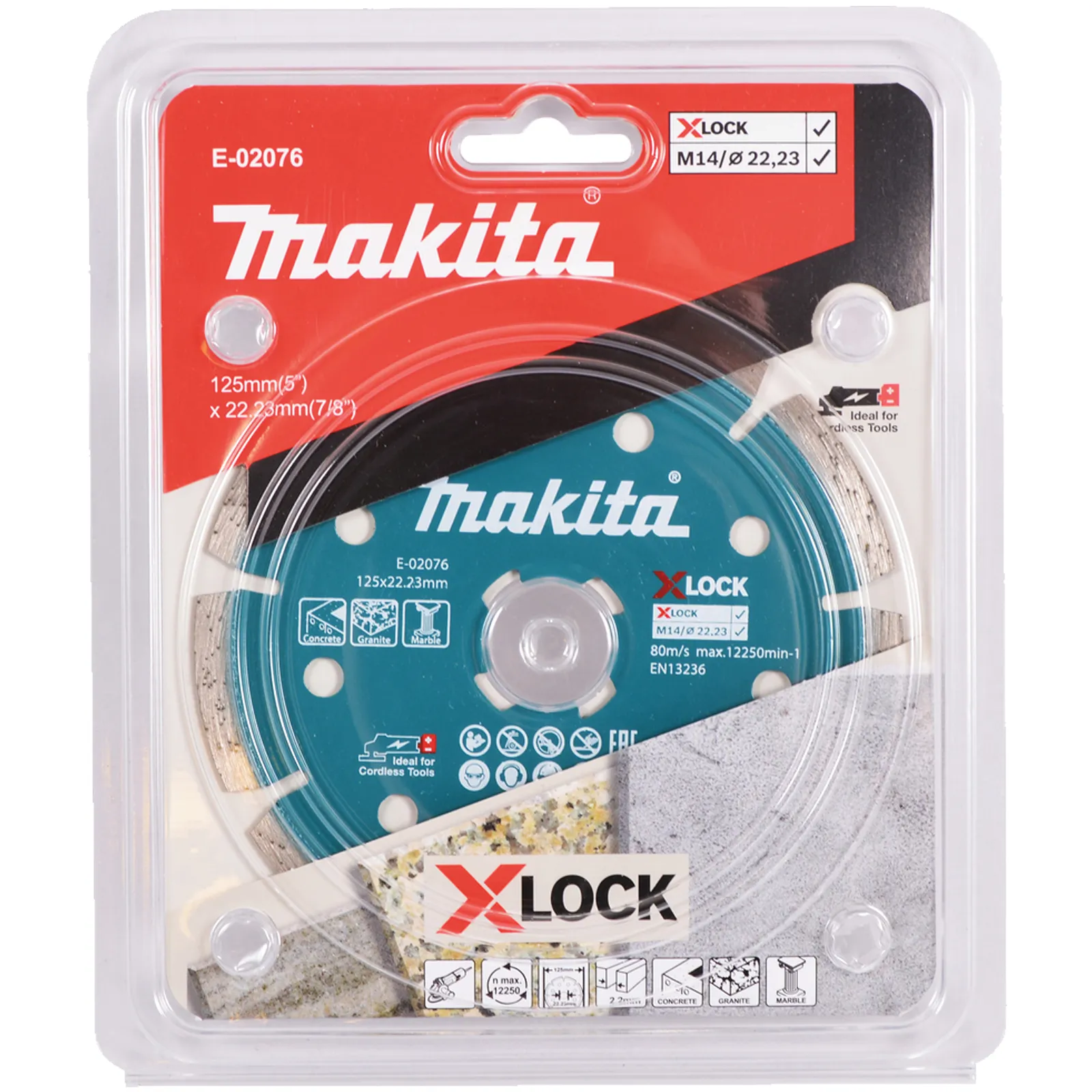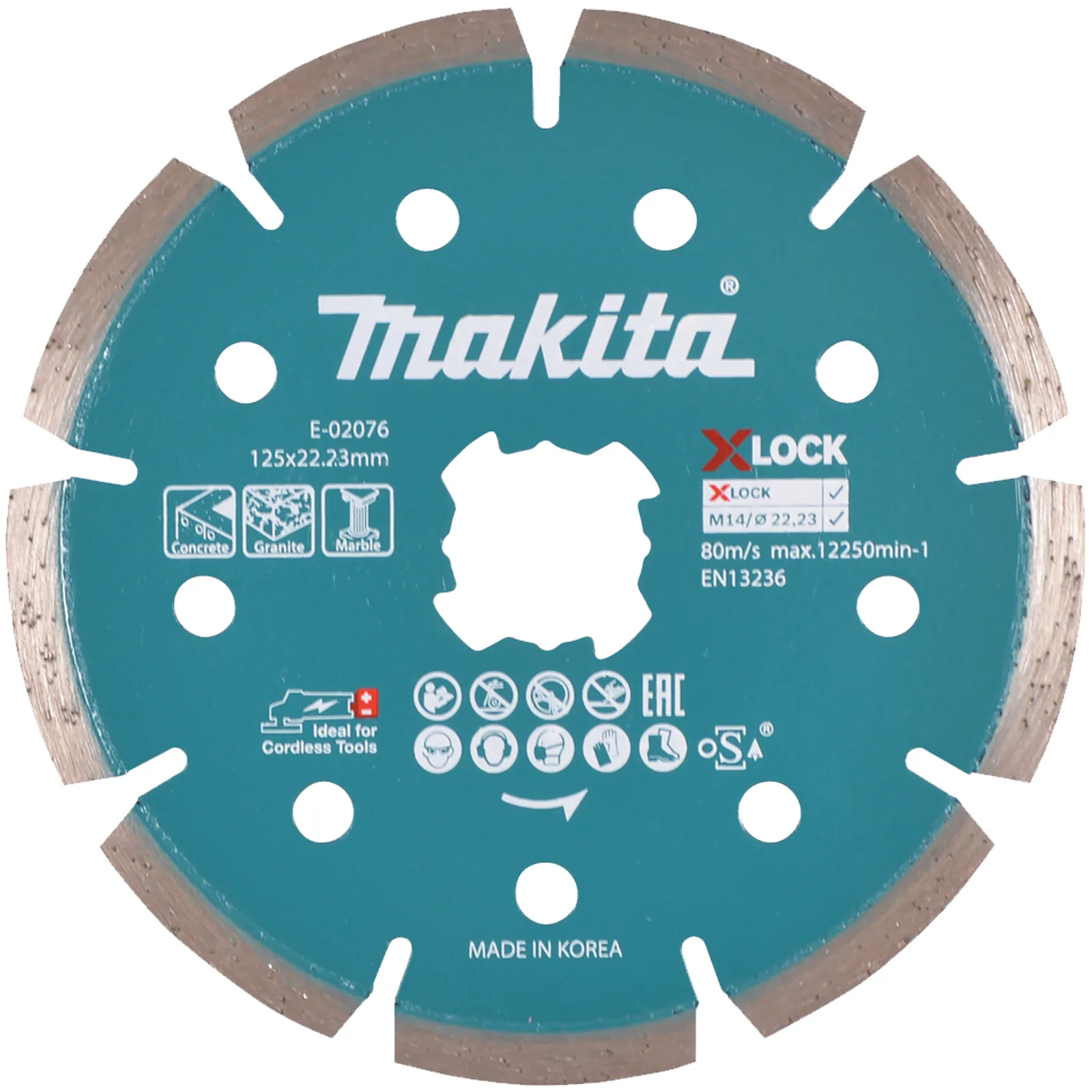 Disco diamantato a settori Makita modello E-02076 della serie X-Lock è un accessorio da taglio professionale per smerigliatrici angolari.