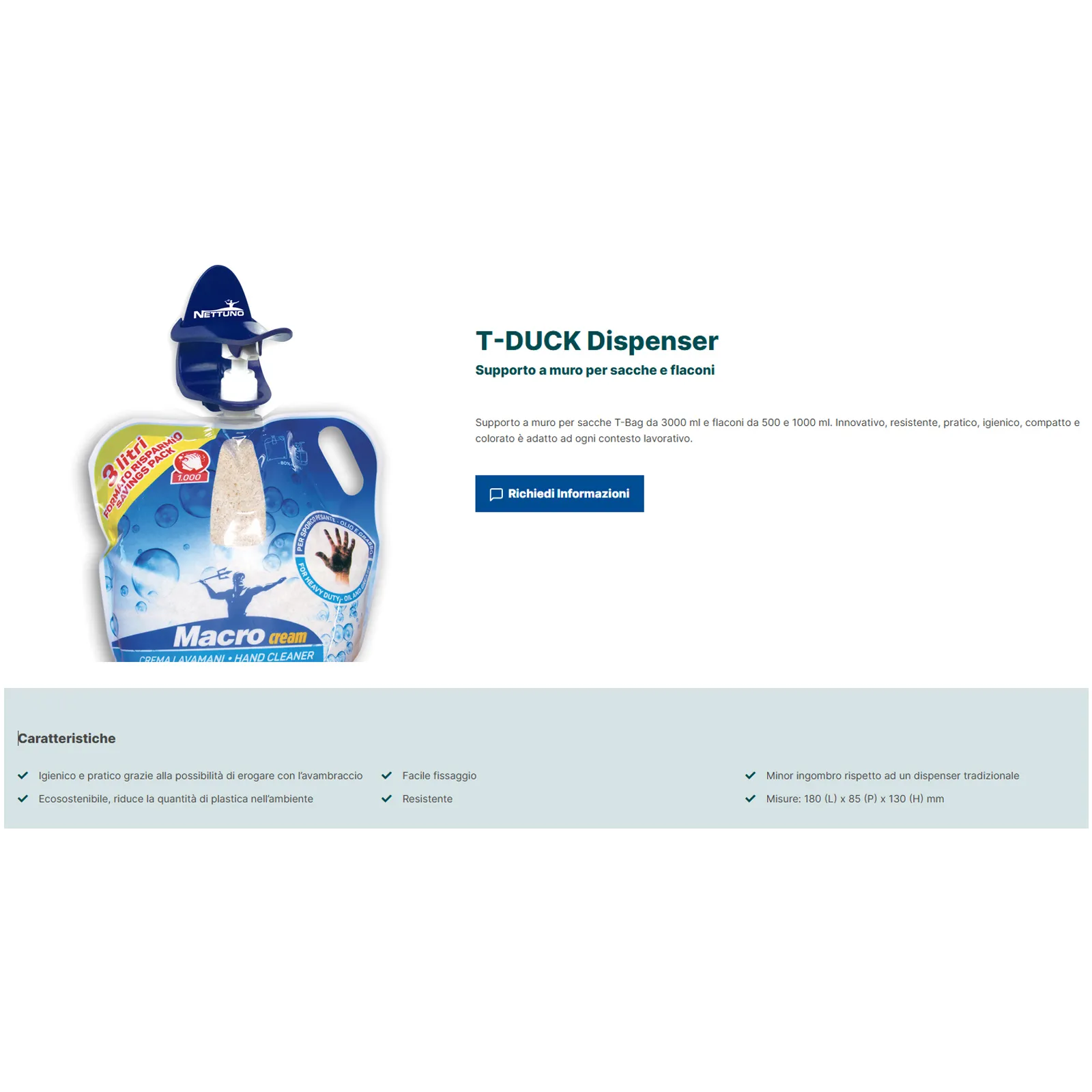 Dispenser a Muro per Creme Gel Lavamani NETTUNO Specifico per Sacche Ricarica T-Bag da 3000ml articolo T-DUCK