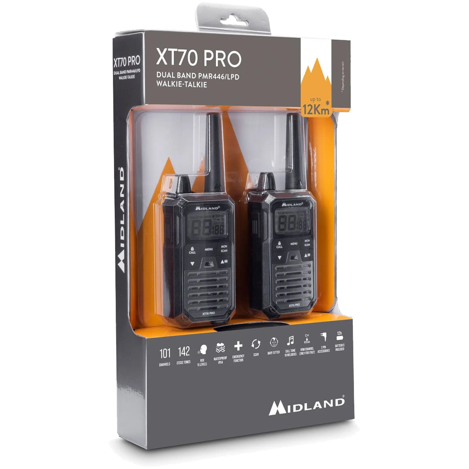 Il Midland XT70 PRO in confezione con doppio Walkie Talkie Professionale, rappresenta la soluzione definitiva per chi cerca affidabilità, prestazioni e sicurezza nelle comunicazioni a distanza.
