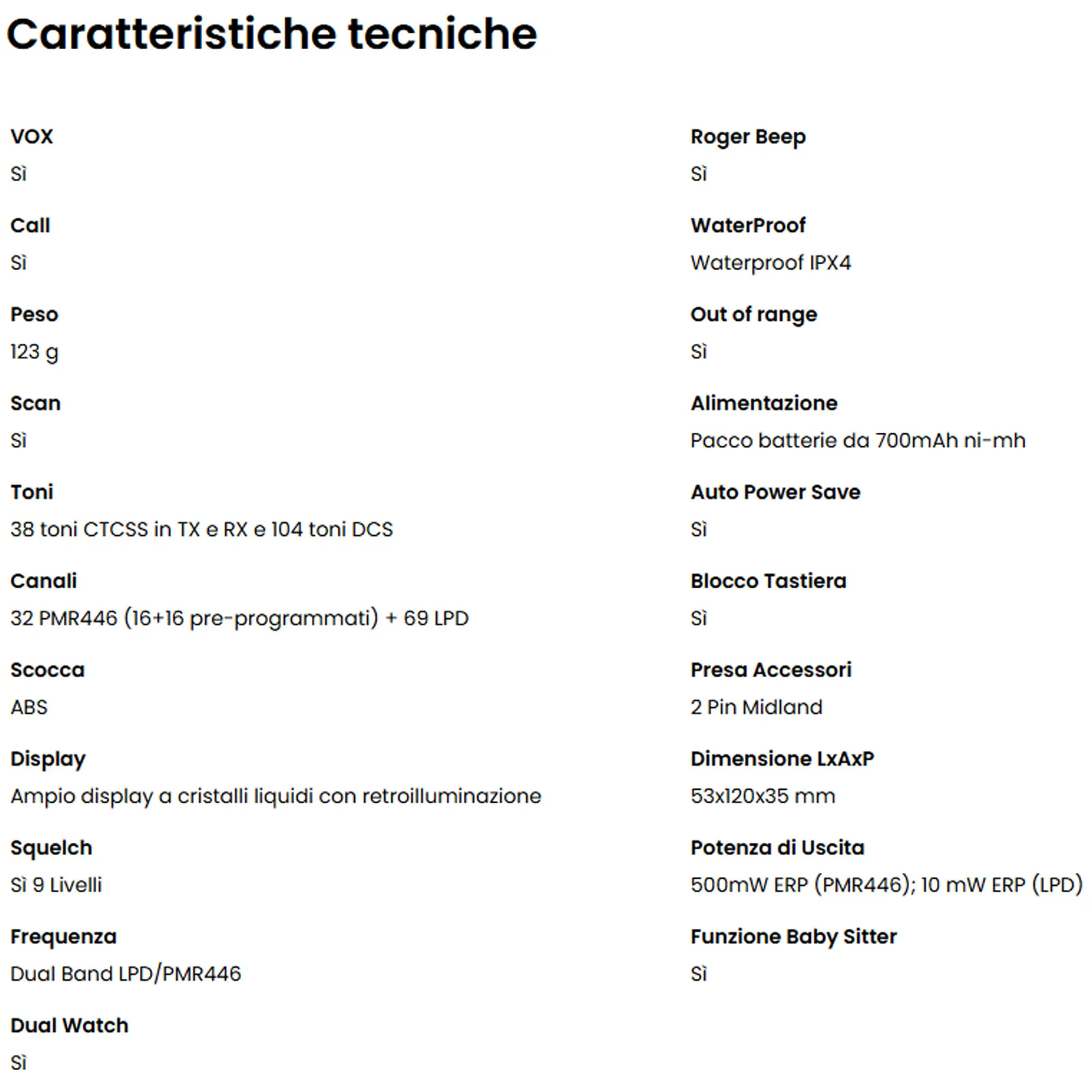 La doppia banda LPD/PMR446 offre ben 101 canali (32 PMR446 + 69 LPD), assicurando la massima flessibilità e la possibilità di trovare sempre un canale libero, anche in ambienti affollati.