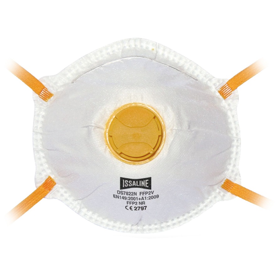 Facciale filtrante per polveri tossiche e nebbie e fumi a base acquosa. Il livello di protezione è pari a 12 volte il TLV (valore limite di soglia pericolosità). La mascherina è dotata di valvola di espirazione.