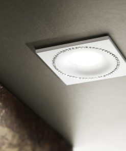 Faretto a incasso in alluminio Coralie. Un elemento di pregio che si distingue dai comuni faretti per le finiture in bianco opaco con strass di cristallo trasparente. Un particolare che donerà ulteriore lucentezza, uno scintillio ed un gioco di riverberi particolarmente suggestivo incastonato direttamente nella struttura in cartongesso.