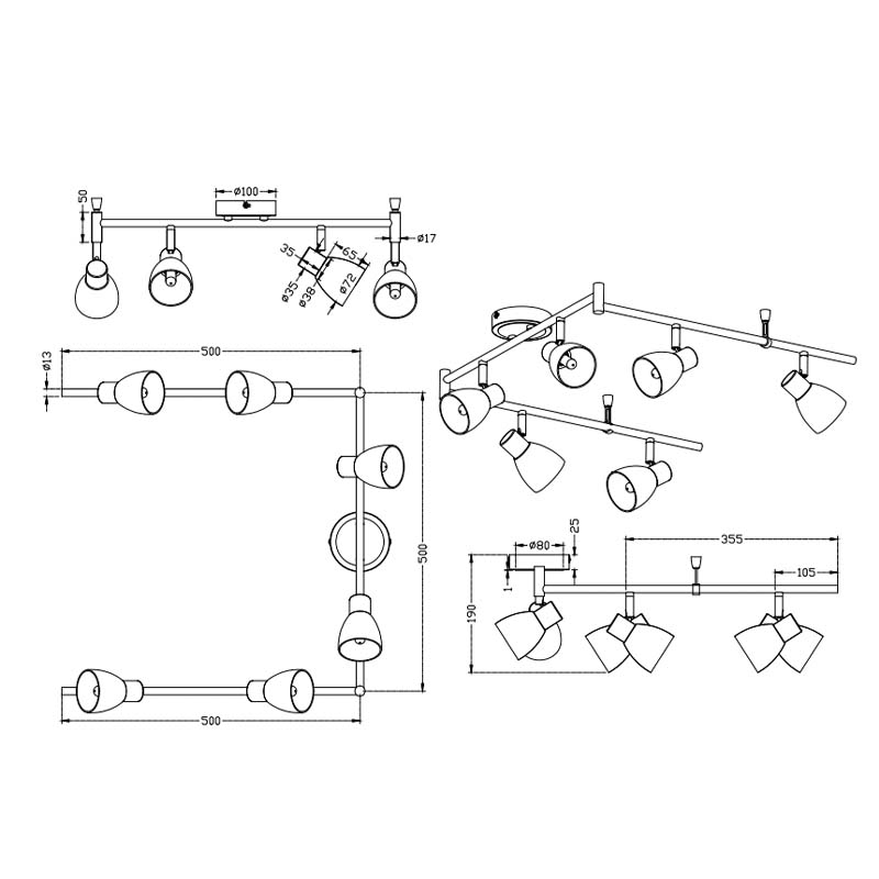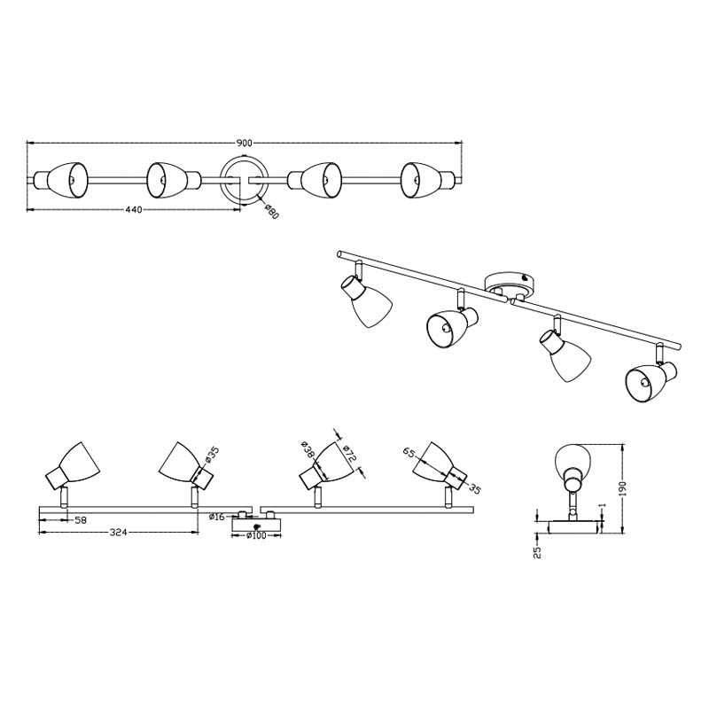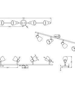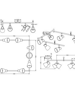 Le barre sono realizzate in alluminio. Essendo girevoli rispetto al punto di fissaggio, permettono di regolare l’angolazione e la direzione dell’illuminazione. Questa caratteristica è particolarmente utile per concentrare la luce su aree specifiche della stanza o per illuminare oggetti d’arte, zone di lavoro o dettagli architettonici.