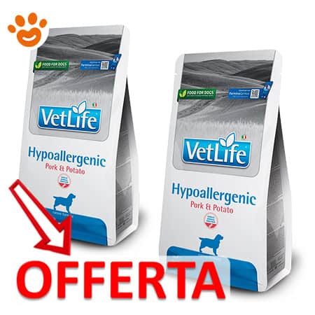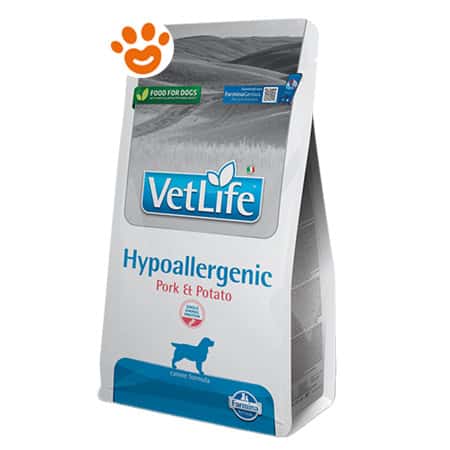 Farmina Vet Life Hypoallergenic Maiale e Patate è un alimento dietetico completo, per cani, per la riduzione di intolleranze a ingredienti e sostanze nutritive; supporto della funzione dermica in caso di dermatosi ed eccessiva perdita di peli.