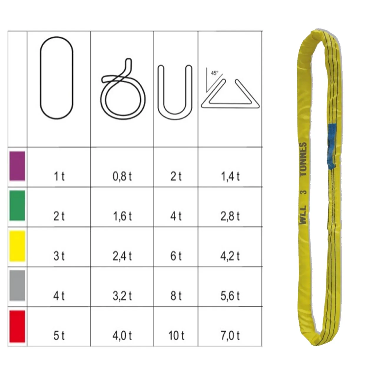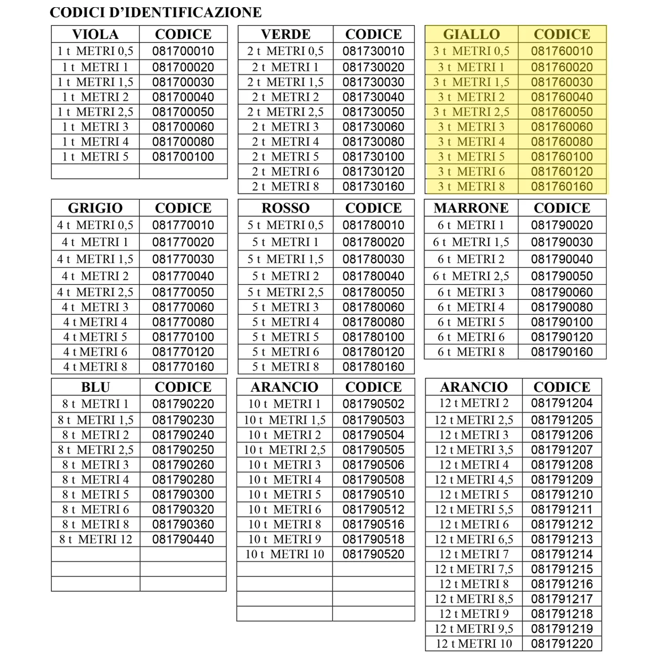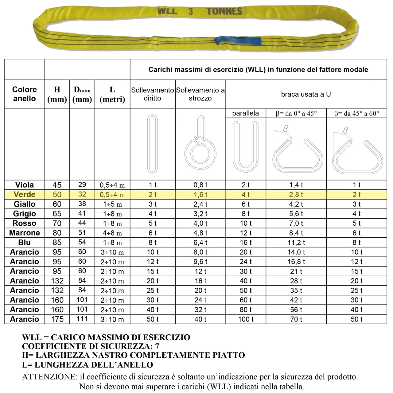 Il colore della braca identifica in modo immediato il carico massimo di esercizio WLL: Giallo = 3 TON.