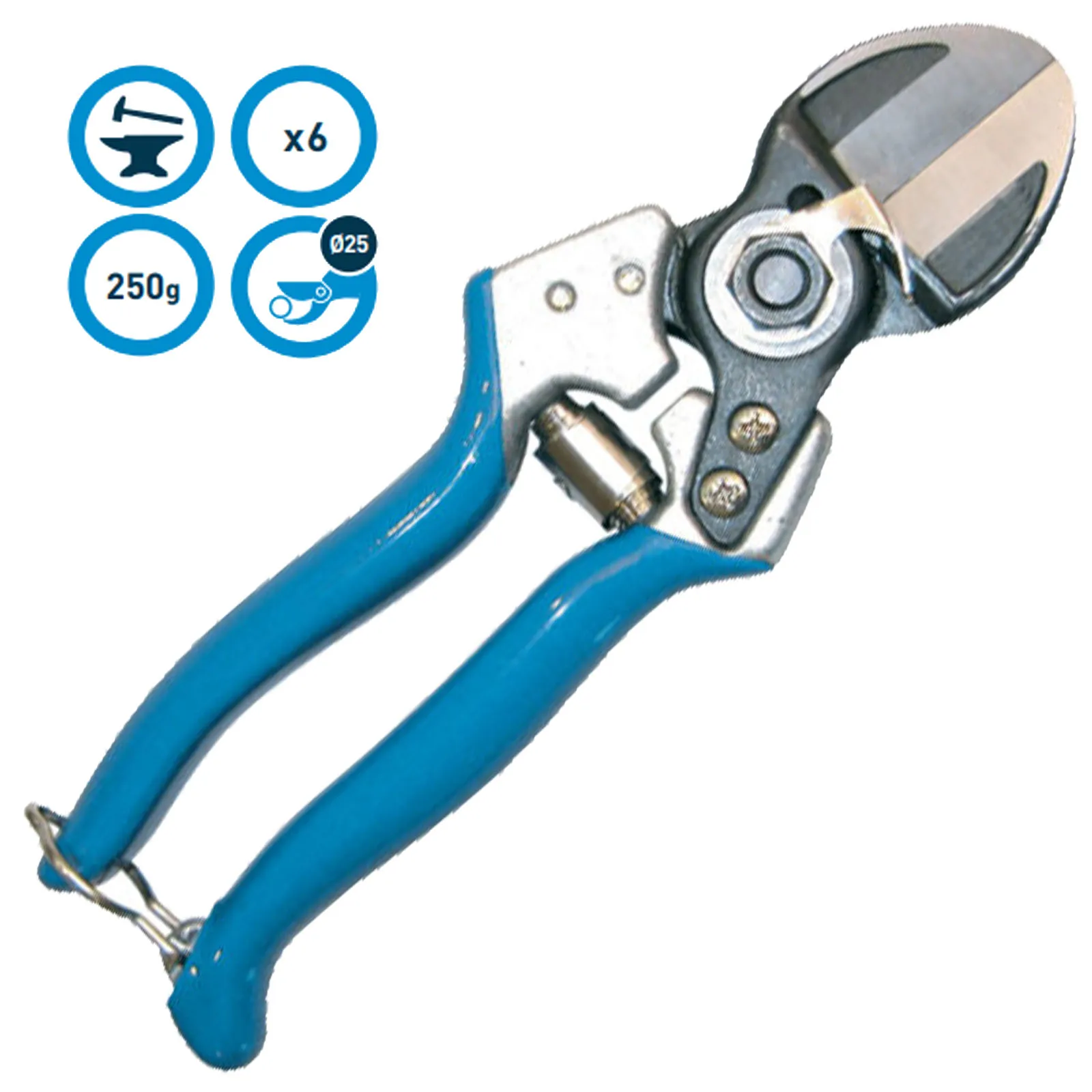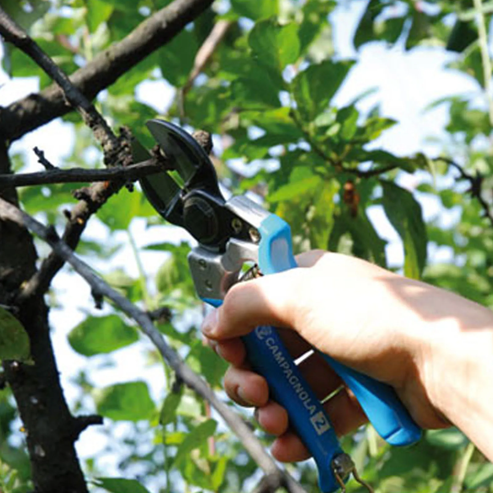 La forbice a doppio taglio Campagnola S2 consente la convergenza delle lame al centro del ramo, realizzando così, con uno sforzo minore rispetto alle forbici tradizionali, un taglio netto e senza alcuna scheggiatura del legno.