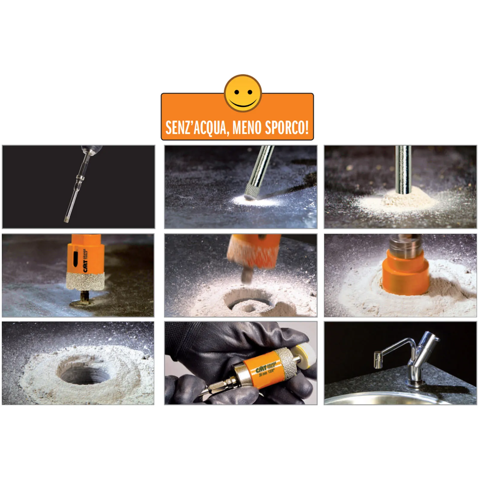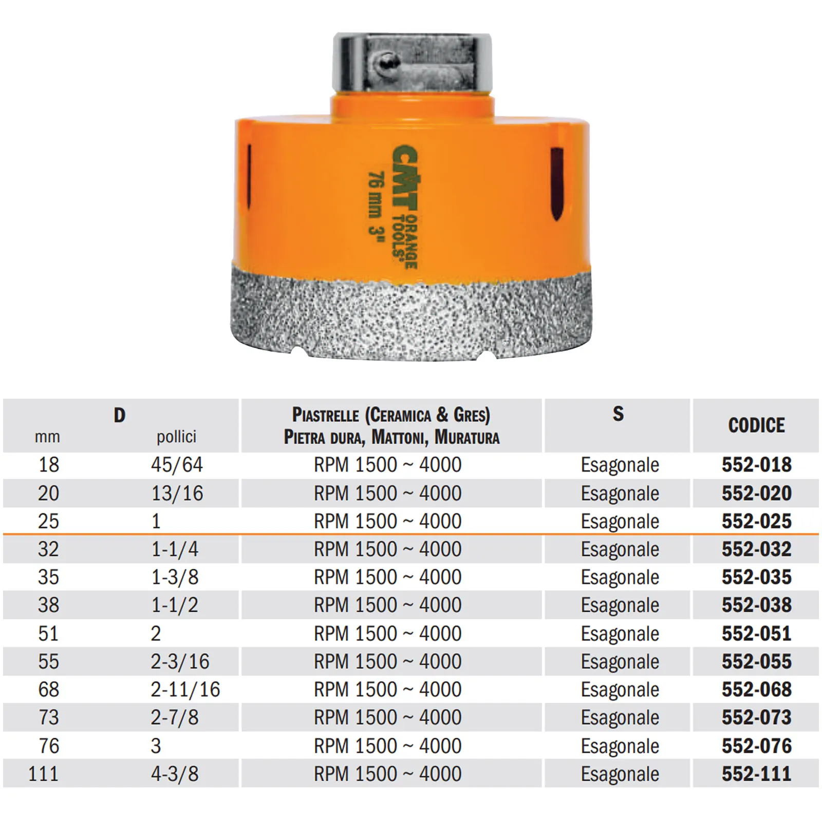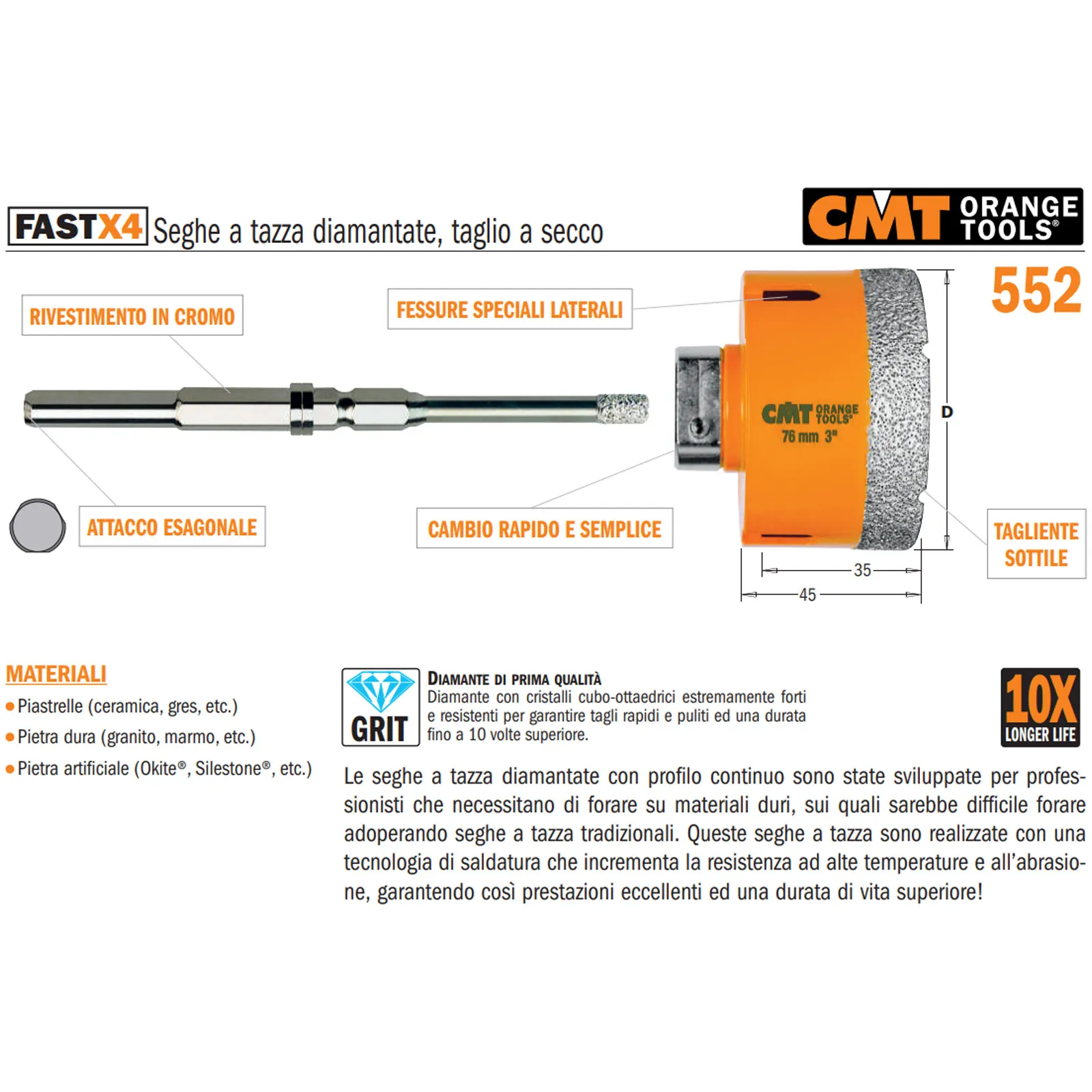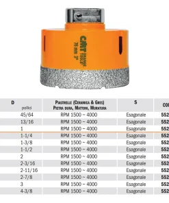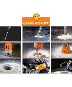 Diamante di prima qualità con cristalli cubo-ottaedrici estremamente forti e resistenti per garantire tagli rapidi e puliti ed una durata fino a 10 volte superiore alle normali frese a tazza diamantate.