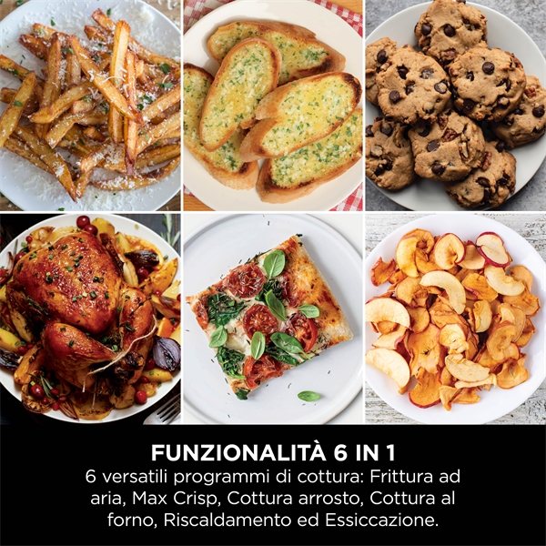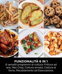 - Programmi di Cottura Preimpostati: Dotata di un pannello di controllo digitale intuitivo, la friggitrice offre diverse impostazioni predefinite per friggere, arrostire, cuocere al forno, disidratare e riscaldare. Questi programmi rendono la cottura semplice e veloce.