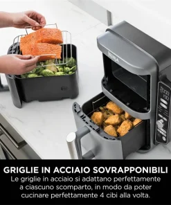 - Design Double Stack: Il design a doppio strato consente di cucinare due diversi piatti simultaneamente, ottimizzando l’uso dello spazio e permettendoti di preparare un pasto completo in una sola volta. Puoi cuocere carne e verdure allo stesso tempo senza mescolare i sapori.