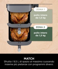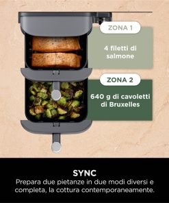 - Versatilità: La possibilità di cucinare diversi tipi di cibo simultaneamente rende questa friggitrice estremamente versatile. Puoi preparare carne, pesce, verdure e molto altro, tutto allo stesso tempo.