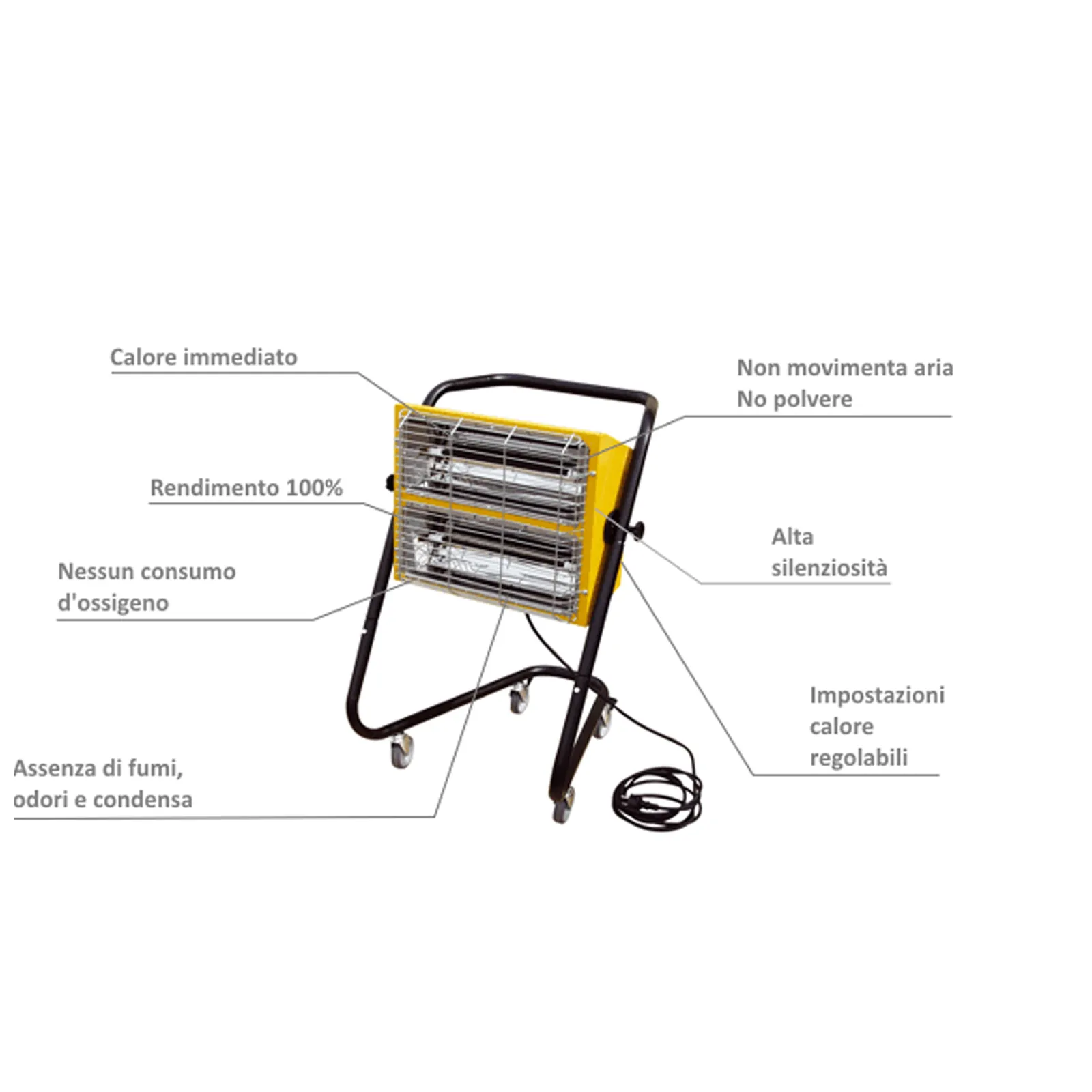 La macchina produce riscaldamento per irradiamento generando calore immediato, senza consumo di ossigeno o movimentazione di aria (polvere, gas, odori ecc). Ha un potenza di 3,0 kW ed in termini di energia è in grado di produrre 5100 – 10.200 Btu/h e 1.290 – 2.580 Kcal/h.