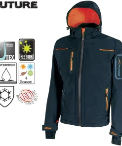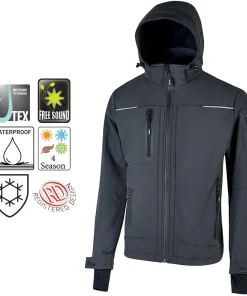 Maniche preformate per vestibilità ottimale, cappuccio regolabile e staccabile, polsini regolabili con velcro e polsino antivento elasticizzato con foro passa-pollice
