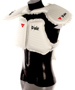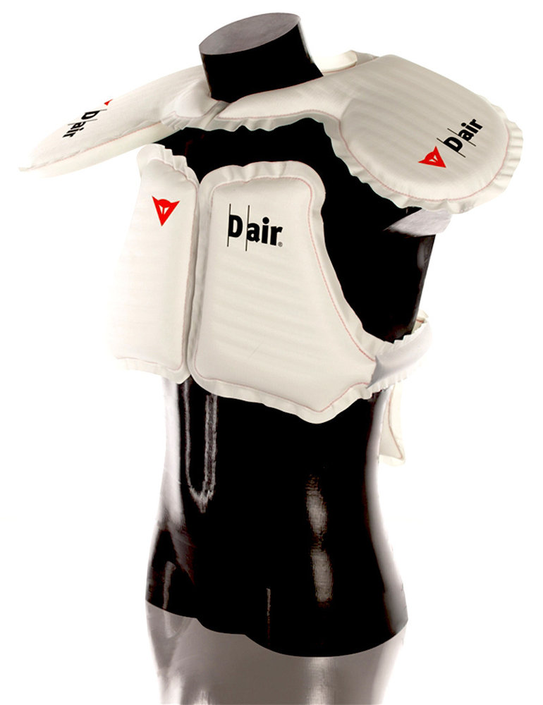 Giubbotto DAINESE D-AIR MISANO NERO/NERO/BIANCO. Giubbotto in pelle sportivo con sistema airbag integrato. Dainese continua a lavorare pensando al futuro e cercando l’innovazione, confermandosi cosi’ una delle aziende leader del settore. La grande innovazione della giacca D-air Misano non necessita di sensori sulla moto, e’ in fatti un giubbotto in pelle con airbag e paraschiena integrato nel quale si trovano sensori, elettronica e controllo Gps. In questo modo i sei sensori del D-air Misano controllano la guida del motociclista ben 800 volte al secondo, intervenendo in caso di urti, cadute o scivolate. Il paraschiena e’ ovviamente collegato alla protezione per il petto, che passa intorno alle spalle per proteggere clavicole, petto, schiena e collo. L’interruttore per attivare l’airbag e’ integrato nella chiusura della giacca.
