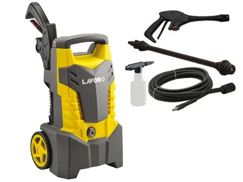 In dotazione: pistola con attacco rapido, lancia getto a ventaglio fisso, diffusore schiuma, tubo alta pressione 3 mt.