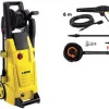 In dotazione: pistola con attacco rapido, lancia con triplo ugello + spazzola fissa, tubo alta pressione 6 mt.