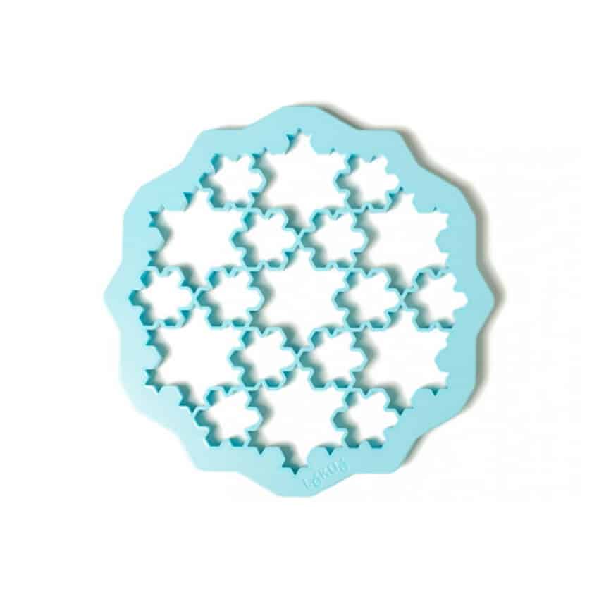 Con il tagliapasta azzurro a forma di fiocco di neve si possono realizzare con un solo taglio 19 fiocchi di neve di due dimensioni.