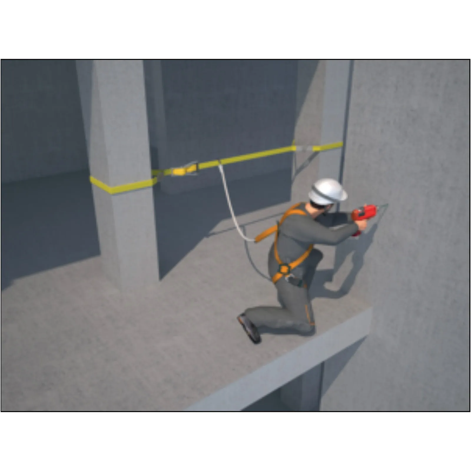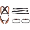 Kit di protezione anticaduta pronto all’uso composta da imbracatura con un punto di ancoraggio dorsale ed assorbitore di energia integrato, non rimovibile, in cinghia di poliestere bicolore.
