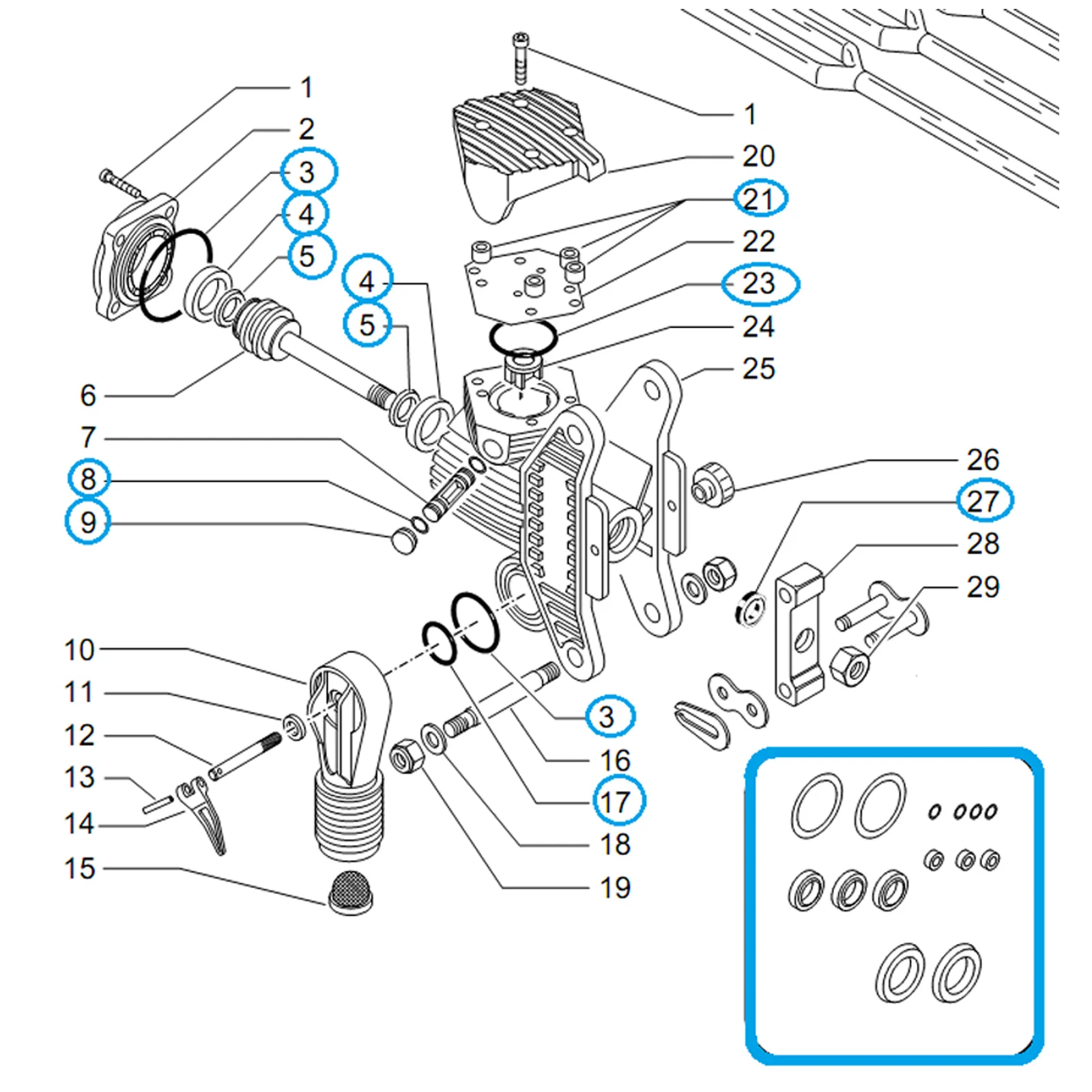 Kit Completo di guarnizioni, o-ring e tutto il necessario per la manutenzione dell’abbacchiatore pneumatico della serie OLISTAR EVOLUZIONE di Campagnola.