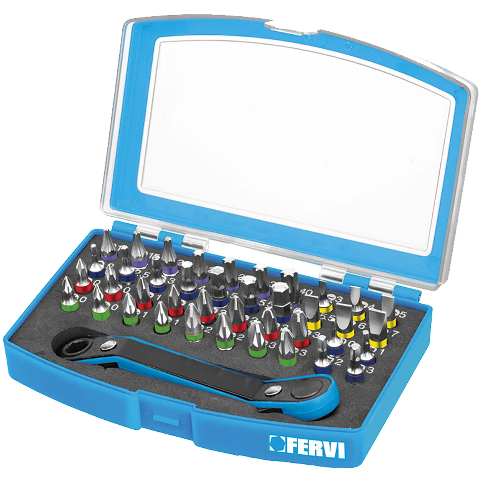 Kit inserti esagonali in acciaio S2 e rivestiti in Nichel, composto da 40 inserti e 1 cricchetto reversibile a 72 denti.