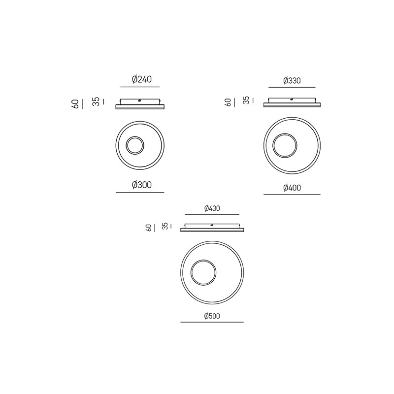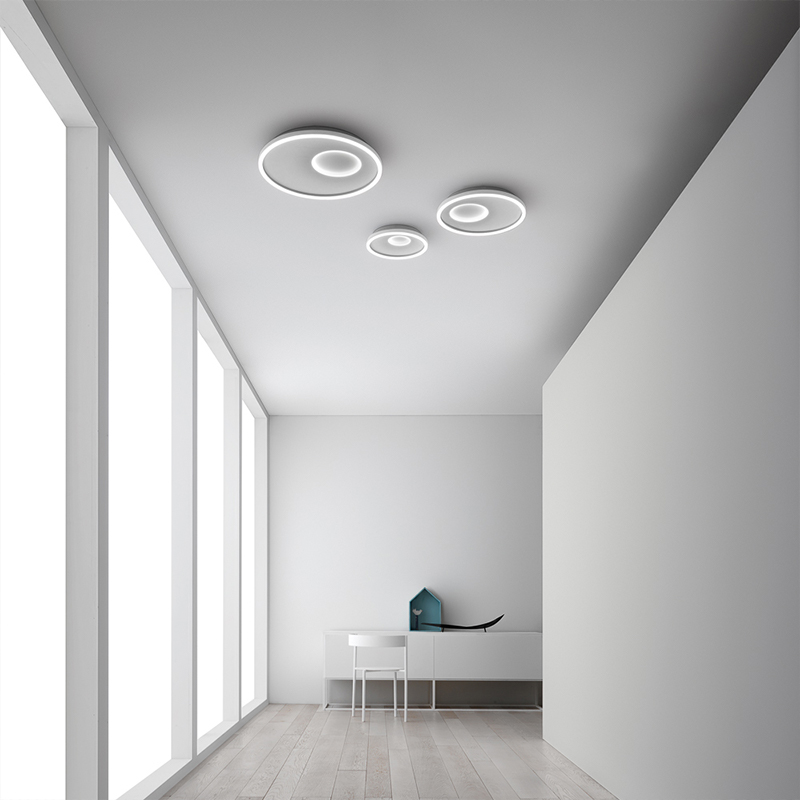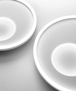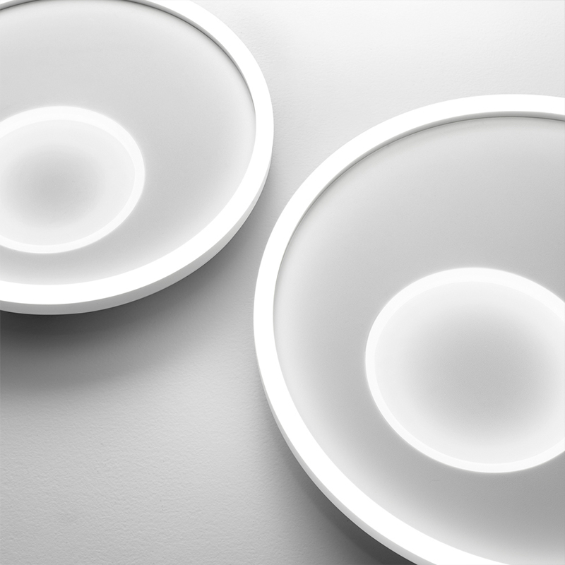Un concept semplice ma dal grande effetto scenico grazie ai cerchi di luce concentrici e decentrati uno rispetto all’altro.