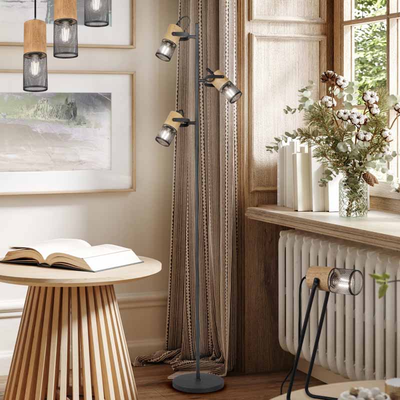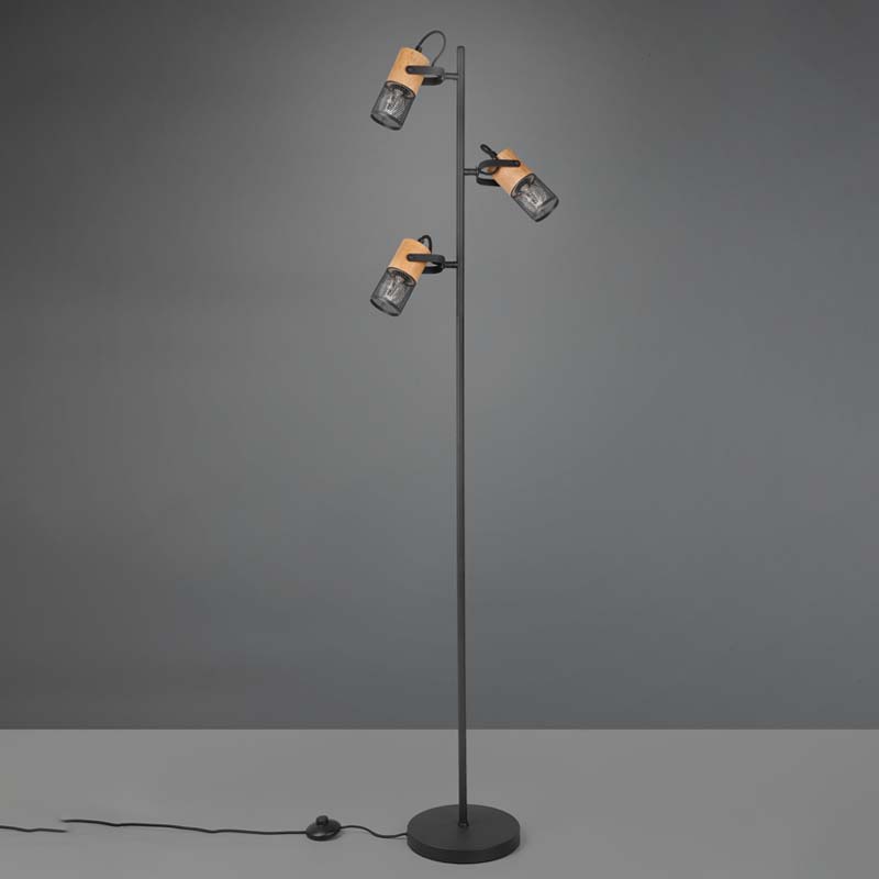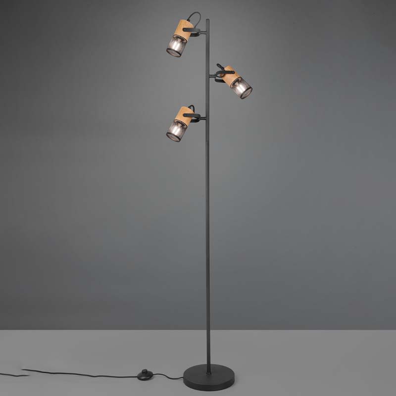 Piantana Led con 3 spot cilindrici in metallo e particolare in legno.