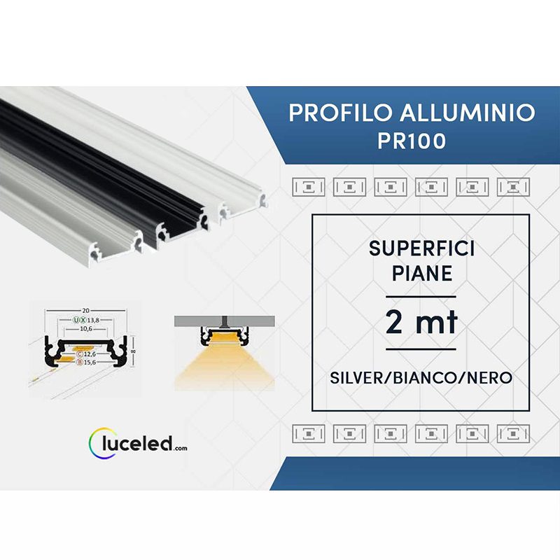Utilizzare un profilo in alluminio nel montaggio delle nostre strip led diventa indispensabile se desideriamo ottenere un installazione stabile e duratura. Esso è studiato per essere fissato a parete e/o a soffitto, accogliendo e proteggendo la striscia led, allungandone notevolmente la durata di vita. In particolare, il Profilo lineare in alluminio in questione è adatto per contenere le strisce Led modello Ledco PR100. Questo profilo è realizzato interamente in alluminio ed è stato progettato per l’installazione di strisce Led su superfici piane. Le dimensioni sono le seguenti: 2 metri di lunghezza, 20 mm di larghezza e 8 mm di altezza. E’ disponibile e può essere acquistato scegliendo tra le seguenti varianti di colore: Silver, Bianco e Nero. Inoltre, essendo un Kit, è completo degli accessori necessari, tra cui lo schermo, che è disponibile in due varianti: trasparente ed opaco. Nella confezione sono inclusi 5 profili da 2 metri cadauno, per un totale di 10 metri, lo schermo trasparente ed il tappo chiuso. I tempi di spedizione sono molto brevi, 3 giorni lavorativi, esclusi sabato, domenica e festivi.