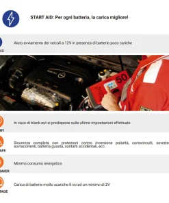 – pinze non alimentate se disconnesse alla batteria – dispositivo anti-scintille, protezioni contro cortocircuiti, inversioni di polarità, sovratensioni in ingresso, batteria guasta.