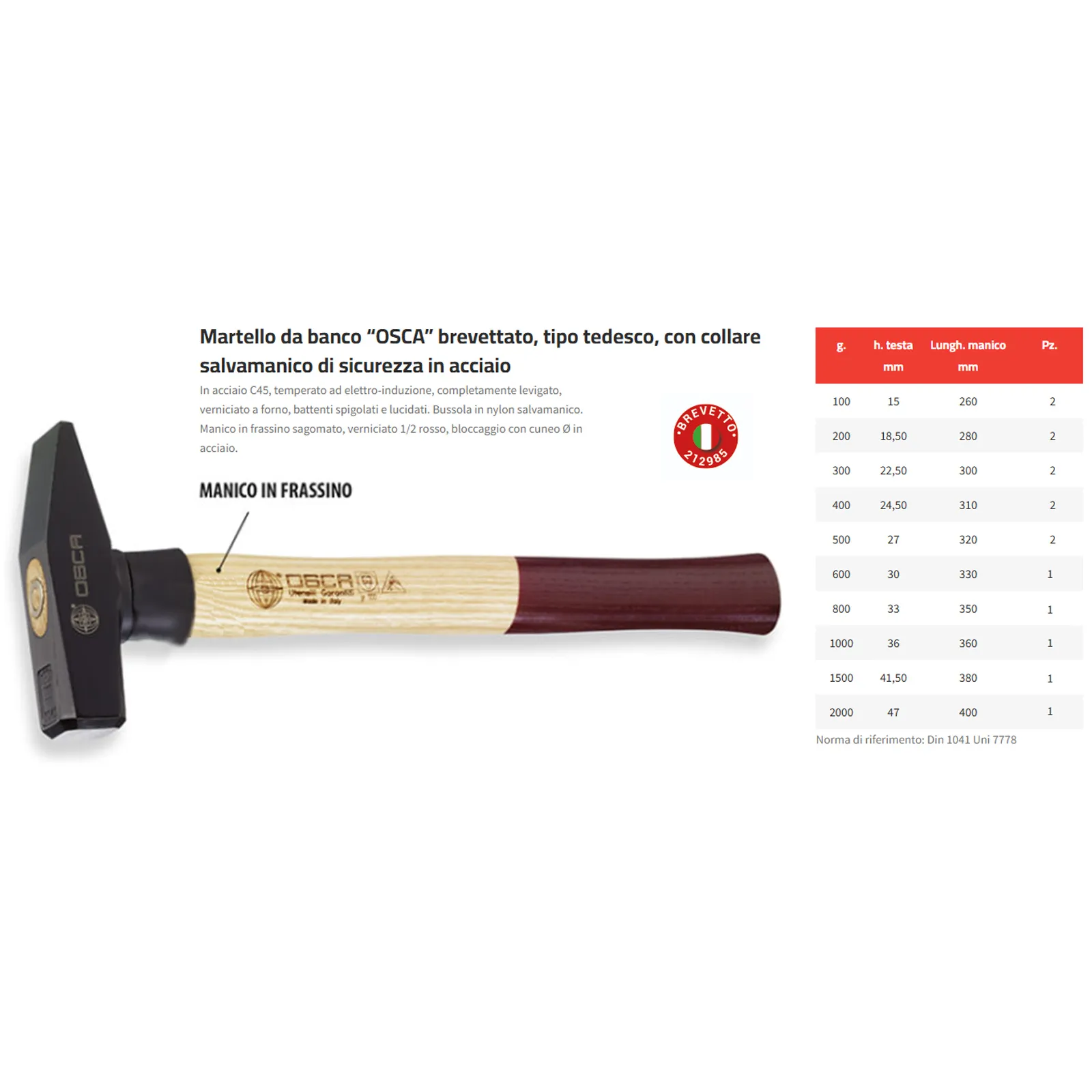 Il martello da banco “OSCA” brevettato, tipo tedesco, con collare salvamanico di sicurezza in acciaio è uno strumento realizzato secondo i più alti standard di qualità, ideale per utilizzo professionale e conforme alle norme DIN 1041 e UNI 7778.