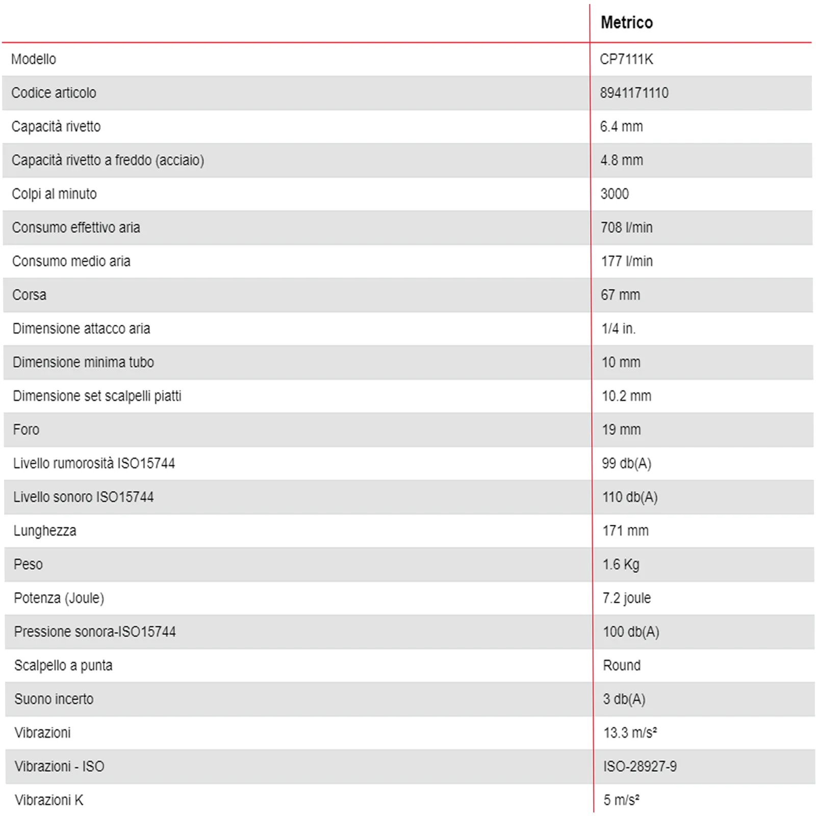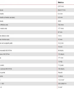 Inoltre, ha l’attacco esagonale da 10,2 mm; pressione di esercizio 6,3 bar, fabbisogno d’aria 96 l/min e soli peso 1,59 kg.