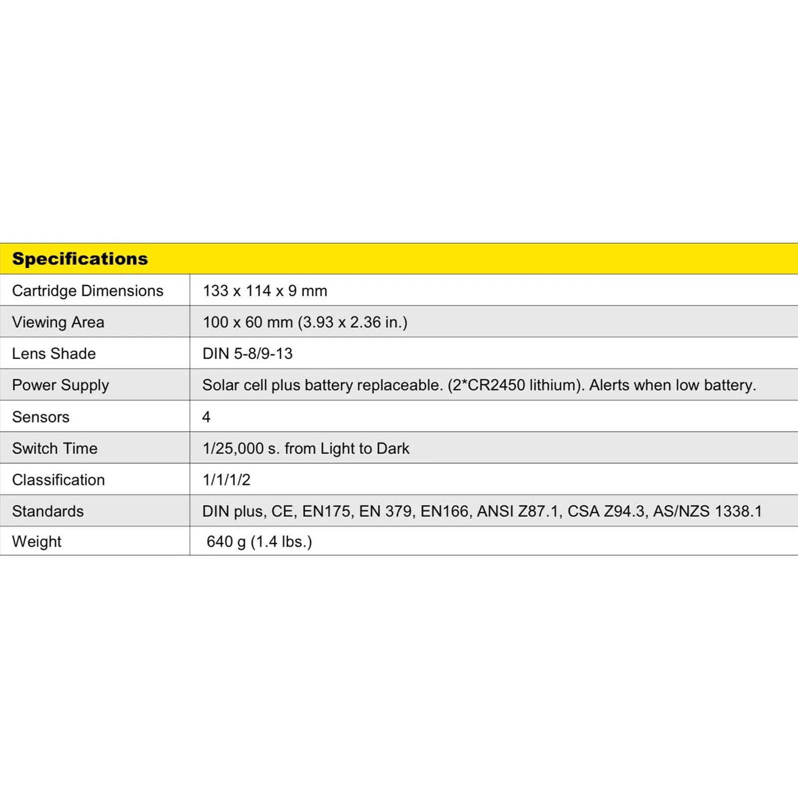 Il casco per saldatura Sentinel A50 è dotato di uno schermo di buone dimensioni (3,93 “x 2,36”, o 9,27 pollici quadrati di spazio visivo), che si oscura automaticamente con una velocità di 1 / 25.000 di secondo.