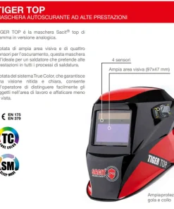 La sicurezza della TIGER TOP è dettata dall’impiego di 4 sensori che garantiscono l’oscuramento del filtro in qualsiasi condizione e ambiente si trovi a lavorare l’operatore.